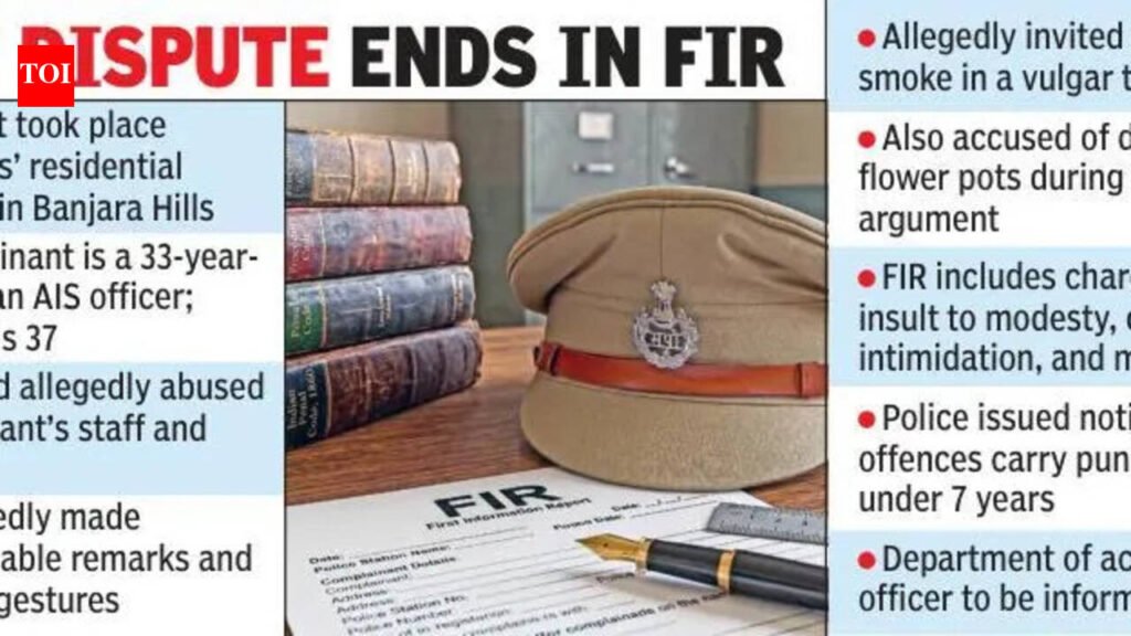 Hyderabad: The Banjara Hills police have booked an All India Services (AIS) officer on charges of sexual harassment after a woman AIS officer, living in his neighbourhood, accused him of using lewd language and gestures during a recent altercation. While the squabble, the complainant claimed, started over dog poop in the common area, it soon escalated, with the accused allegedly passing objectionable comments “in a vulgar tone”.Based on a complaint by the 33-year-old woman officer, cops registered a case under Sections 75 (sexual harassment), 79 (word, gesture or act intended to insult the modesty of a woman), 324(4) (mischief), 351(2) (criminal intimidation), and 352 (intentional insult with intent to provoke breach of the peace) of the BNS against the male officer and began an investigation. He was also taken to the police station for questioning.“We let him go after issuing a notice (requiring him to be available for further interrogation) since the maximum punishment under these sections is less than seven years. We will inform his head of department about the incident as well,” an official of Banjara Hills police said.In her complaint, the woman officer alleged that at around 6.40 pm on April 13, while she was at her quarters, she heard some commotion outside and went to the living room.What’s the dispute“I heard my neighbour abusing my staff and my dog. He kept opening and shutting his door, making a loud noise each time. He came out and said, ‘Bhabhi, come, let’s smoke a cigarette,’ in a vulgar tone and kept repeating it,” the complaint alleged. The 37-year-old male officer also, allegedly, damaged her flower pots.Cops said that the complainant recorded the entire incident — where he is seen repeatedly making sexually offensive remarks and obscene gestures — and handed it over to the police.“During questioning, the male officer said that he saw dog poop near his door and, since the complainant keeps a pet dog, suspected her of negligence,” said a police official, reiterating how the argument started. “When our team inspected the premises, they realised that there are a lot of stray dogs around the quarters that often poop in the common area. We are probing the matter further to ascertain why the male officer resorted to obscene behaviour,” the officer added.