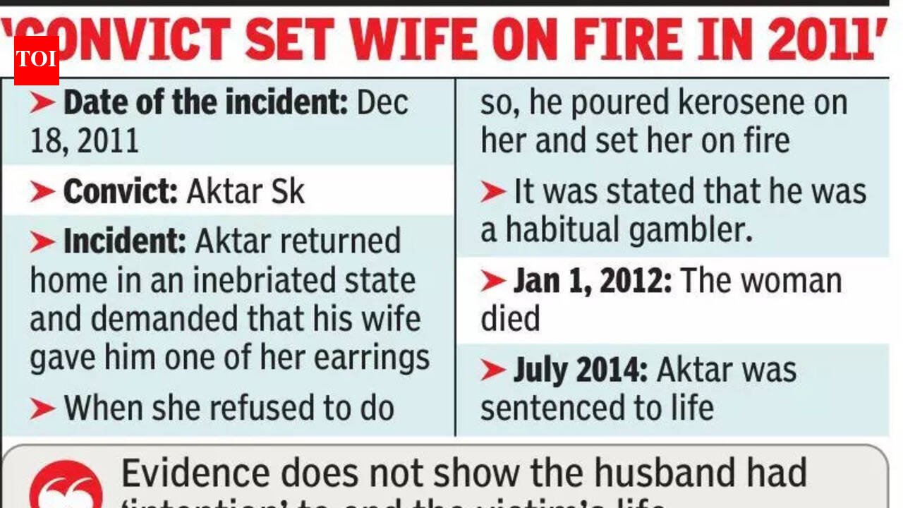 Kolkata: “Had he not been drunk, he may not have committed the murder,” the Calcutta High Court observed, reducing a murder charge to culpable homicide not amounting to murder against a man, who he set his wife on fire for refusing to give him her earring for gambling. The man has spent 13 years in jail, serving a life sentence for the murder. The maximum sentence for culpable homicide not amounting to murder is 10 years.The division bench of Justice Rajasekhar Mantha and Justice Md Shabbar Rashidi said the couple was married for 17 years. They observed that if the husband had an intention to kill his wife, he would not have called a “quack” to treat her or hired a taxi to take her to her paternal home for admission to Anupnagar BPHC Hospital. The case dates back to Dec 18, 2011, when Aktar Sk returned home drunk, asked his wife for an earring, and, on refusal, set her on fire. It was stated that he was a habitual gambler. There was no witness as two turned hostile, while others stated on a hearsay basis. The only proof that could ascertain the man’s culpability was the bed-head ticket at the two hospitals—Anupnagar and Jangipur SD Hospital—where the wife was treated for her burns. She, before dying, told the doctors that the husband returned home drunk, asked for her earring for gambling, she refused, and he set her on fire.While this proved Aktar did commit the offence, it could not prove he had the intention to kill her. The division bench stated, “Evidence does not show the husband had ‘intention’ to end the victim’s life… . There is no evidence on record of any torture by the husband on the victim. No previous complaint was lodged by the victim and her family. On the contrary, the failure on the part of the complainant (victim’s brother) to notify police of the incident from Dec 19, 2011 to Jan 1, 2012 would support the case of the defence that there is little or no evidence of offence under Sec 302, much less any offence under Sec 498A of the IPC.“