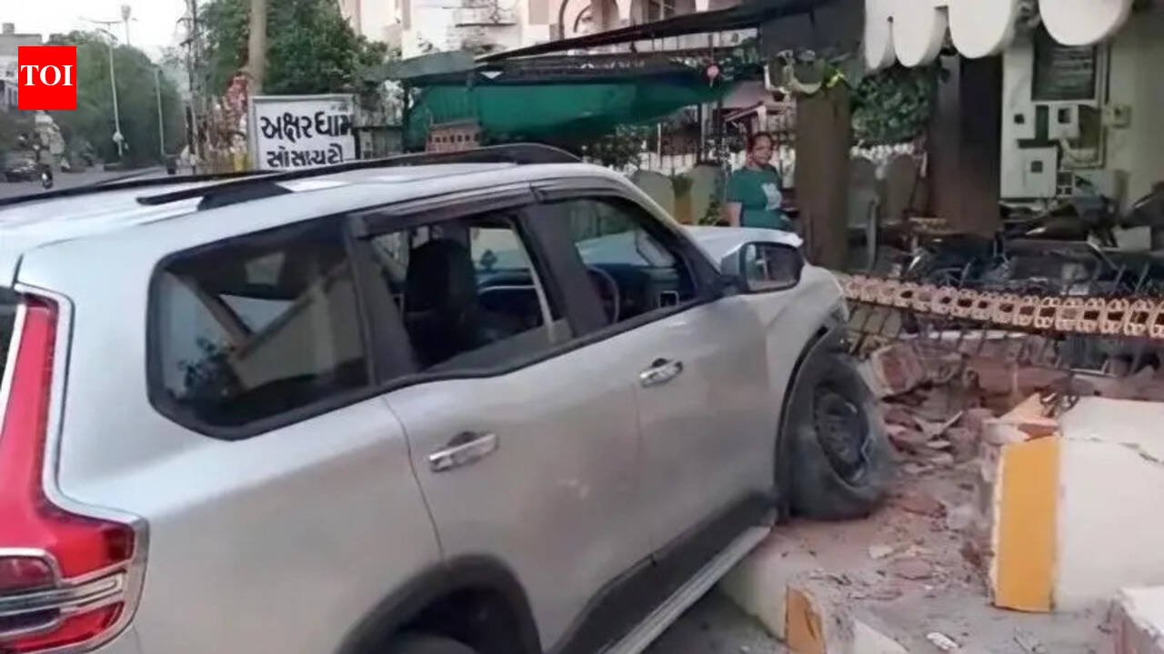 Vadodara: Residents of Akshardham Society in Akota woke up to a loud bang early on Thursday when an SUV rammed into the compound wall of a bungalow. The impact was so severe that a portion of the wall collapsed.Police identified the driver as 25-year-old Sachin Kashyap, a resident of Vasna-Bhayli Road. When Kashyap stepped out of the vehicle, he was barely able to stand. Locals alerted the police, who reached the spot and questioned him. According to police, Kashyap was in a drunken state and lost control of the vehicle. An FIR has been registered against him at JP Road police station for rash driving and driving under the influence of alcohol. The incident has again highlighted the rising cases of rash and drunken driving in the city.