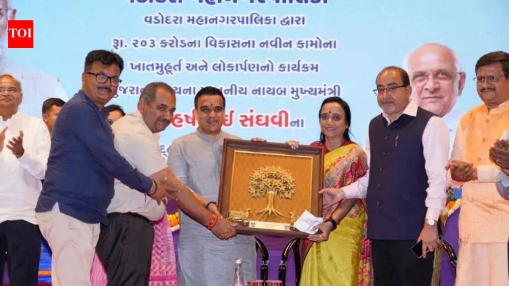 Vadodara: Deputy chief minister Harsh Sanghavi on Friday dedicated several development works to the city and launched new projects worth Rs 203 crore. He also announced that a light-and-sound show and other visitor facilities will soon be developed in the Sursagar and Nyay Mandir areas.Sanghavi, who is also the in-charge minister for Vadodara, said the government is expanding urban infrastructure in view of the rapid growth in the population and geographical spread of cities. Praising the efforts of Vadodara Municipal Corporation (VMC) staff during the 2024 floods, Sanghavi said employees and workers worked tirelessly despite the crisis. “They could have chosen to stay at home, but instead they stood with the people and ensured relief work continued,” he said.Highlighting upcoming projects, Sanghavi said the state government and VMC will contribute Rs 20 crore each to develop the light-and-sound show at Sursagar. The proposed heritage square near Nyay Mandir will also soon take shape.Sanghavi further said that Vadodara will host the regional Vibrant Gujarat summit, strengthening the city’s role in the state’s development agenda.Later, he also launched the MP Office E-Portal at the office of Lok Sabha MP Dr Hemang Joshi. The portal features an AI-based citizen connect platform aimed at improving communication and grievance redressal for residents.