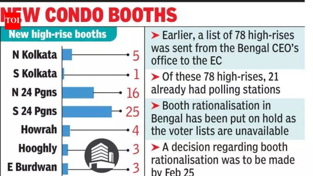 Kolkata: The EC will set up polling stations in 57 more residential high-rises across Kolkata, Howrah, Hooghly, North 24 Parganas, South 24 Parganas and East Burdwan, a senior Commission official said on Wednesday.Earlier, a list of 78 residential high-rises with at least 300 and 500 voters was sent from the Bengal CEO’s office to the EC to set up polling booths in the forthcoming Assembly elections in the state. “Of these 78 high-rises, 21 already had polling stations on their premises. We will set up polling stations in the remaining 57 high-rises this time,” the official stated.However, booth rationalisation in Bengal has been put on hold as the voter lists are unavailable. According to the EC’s revised schedule, a decision regarding booth rationalisation was to be made by Feb 25.The last date of publication of the final electoral roll is Feb 28. That list is unlikely to contain a little over 60 lakh names, and the Supreme Court entrusted the responsibility of scrutinising their documents and final disposal to the judicial officers. Passing an order on Tuesday, the Supreme Court said that if the verification exercise undertaken in respect of the ‘logical discrepancy/unmapped category’ remains incomplete as on Feb 28, the EC may publish the final list, followed by supplements to the final list. “Such supplements shall be published on a continuous basis as soon as the pending exercise is completed in part or in full,” the order said.“Since the number of voters is not yet finalised and will not be on Feb 28, as the supplementary lists will be published then as directed by the Supreme Court, reorganisation of polling stations is not taking place. Only 57 additional booths will be added for high-rise buildings,” an official said. The Commission will send proposals for setting up polling booths in the residential complexes through DEOs.Bengal now has 80,681 polling booths. Before the SIR began, there was a need to create approximately 14,000 additional booths based on the number of voters. The Commission also mentioned the possibility of reorganisation due to over 58 lakh names being excluded from the draft SIR list.The Commission previously stated that new booths would be created if there were more than 1,200 voters. As the SIR work is not completed, the calculation of how many voters were added or removed is not available. In this situation, the Commission stated that the previous booth arrangement will remain in place for now.