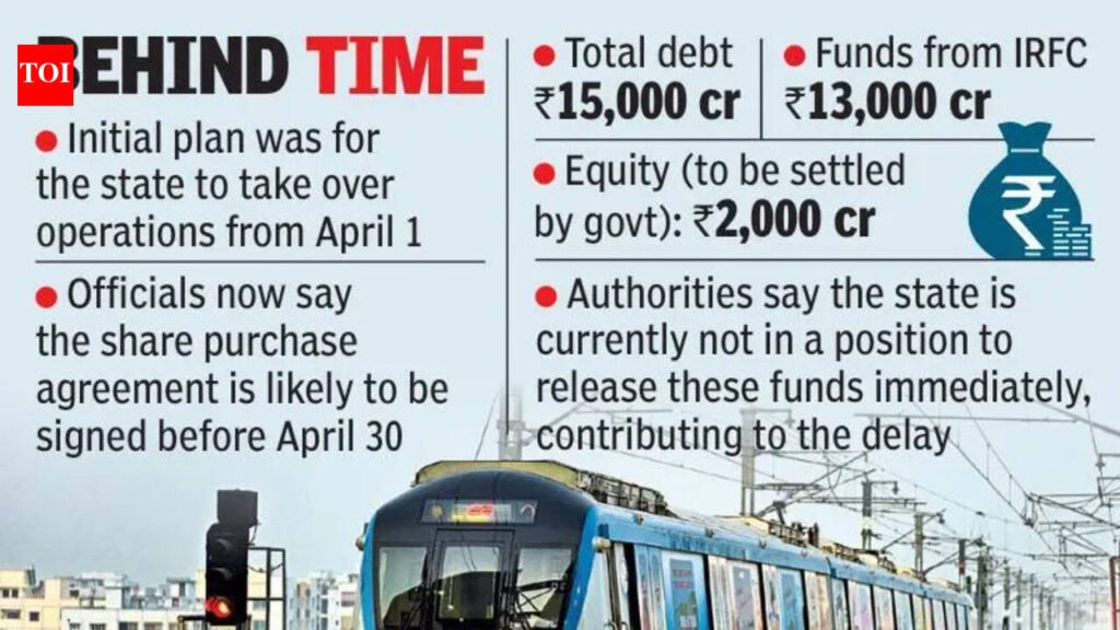 Hyderabad: Six months after formally deciding to part ways, the transition of Hyderabad Metro Rail from Larsen & Toubro to the state govt remains stuck in procedural limbo, with the crucial share purchase agreement yet to be finalised. Though the plan was for the state to take over operations from April 1, the start of the financial year, officials now indicate that the agreement is likely to be signed before April 30. Sources said the consultant, IDBI, is in the process of finalising the share purchase agreement and will soon submit it to the govt. Officials in the municipal administration department attributed the delay partly to the ongoing process of firming up borrowing arrangements with the Indian Railway Finance Corporation (IRFC). “It has been decided to raise around Rs 13,000 crore from IRFC as part of the takeover plan. Of the total Rs 15,000 crore debt, nearly Rs 2,000 crore is equity. While the debt component will be settled with lenders, the equity portion is to be paid to L&T,” sources said. However, arranging this equity has emerged as a key hurdle. Since the govt is taking over the project through Hyderabad Metro Rail Limited, it is required to settle the equity component, but officials said the state is currently not in a position to release these funds immediately, contributing to the delay. Under the financing plan, IRFC will fund nearly 75% of the debt — about Rs 13,000 crore — in Japanese yen, while the remaining 25% will be mobilised in Indian rupees. Officials noted that the share purchase agreement is the central document governing the entire transaction, detailing payment structures, conditions, and operational arrangements.Delay in clearancesAnother factor slowing progress is the delay in administrative clearances. Officials said the consultant is awaiting time from the chief minister, who also holds the municipal administration portfolio, to review and finalise the agreement. His recent engagements, including assembly sessions and election campaigning in Kerala, have pushed timelines. Once the agreement is closed, the govt is expected to shift focus to operational continuity and may formalise arrangements with the existing agency handling the metro’s technical operations.