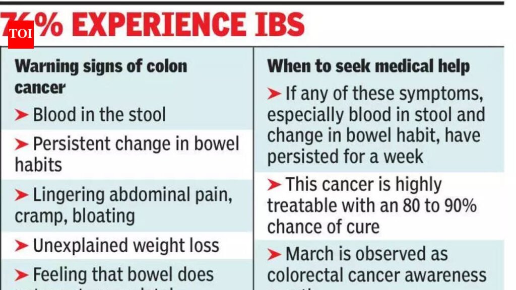 Kolkata: Colon cancer, which was once considered a disease of the elderly, is now rising among younger adults at an alarming rate. Doctors in the city said that they are detecting the cancer in an increasing number of patients as young as in their 30s and 40s. They blame an unhealthy diet, including processed food and a sedentary lifestyle, obesity, and low awareness on gut health for this emerging health concern.“Colorectal cancer is the fifth most common cancer. While this was mostly associated with older adults, we are now seeing many in their late 30s and 40s getting this cancer,” said medical and haemato oncologist Sudeep Das of Manipal Hospital EM Bypass. In contrast to this alarming trend, a survey conducted by Merck Specialities Pvt Ltd found a whopping 91% of Kolkatans recognise blood in stool, the most prominent warning sign of colon cancer. March is observed as colorectal cancer awareness month around the globe. The report on pan-India Lifestyle & Digestive Health Awareness Survey across 14 Indian cities to identify major gaps in colorectal cancer awareness was released in Kolkata on Tuesday. Among the 10,198 respondents across the 14 cities, the sample size for Kolkata was 466 people in the age group of 25 to 55 years. “We should not be missing symptoms such as persistent bowel habit changes, blood in stool, abdominal discomfort, fatigue, or unexplained weight loss. Colorectal cancer is highly treatable if detected early,” said medical and haemato oncologist Poulami Basu of NCRI Hospital Kolkata.The survey found 76% of the respondents experiencing irritable bowel movement, which is indicative of a high prevalence of digestive symptoms among individuals in the city. But 92% of the participants said they delay seeking professional help even after noticing the bowel habit change for a prolonged time. “Lifestyle and food habits play a major role in the rising incidence of this cancer. Frequent consumption of processed food, lack of physical activity, tobacco use, and obesity can increase the risk of this cancer. Adopting healthier habits such as a fibre-rich diet, regular exercise, avoiding tobacco, and undergoing routine screening can reduce the risk,” said medical and haemato oncologist Sanchayan Mandal of HCG Cancer Hospital, Kolkata. Health experts said the cancer develops in the colon or rectum as a small growth, which in the long run becomes cancerous. Only in a few cases, doctors found the cancer in the younger population linked to genetics. “Another alarming concern we came across during this survey is that most individuals try home remedies or over-the-counter medication for digestive symptoms. This behaviour delays early diagnosis, whereas this cancer is highly treatable with an 80 to 90% chance of cure if detected in stage 2 and 1 respectively,” added Das.