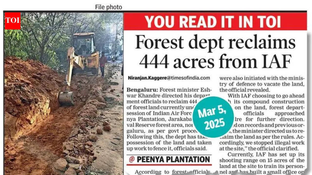 Bengaluru: The Indian Air Force’s (IAF) failure to secure clearance for 444 acres of forest land off Jalahalli in north Bengaluru — despite repeated reminders from the forest department over seven years — has prompted the state govt to initiate steps to reclaim the land from what it terms “illegal possession”. Forest officials are gearing up to serve notice on IAF under the Karnataka Forest Act, 1963 to recover the land.The issue escalated in March 2025 after the IAF authorities attempted to build a compound wall around the Peenya plantation in Jarakabande reserve forest, allegedly in violation of the rules. Visiting the site, forest minister Eshwar Khandre reviewed records confirming the land’s forest status, and directed officials to reclaim it and install departmental signage besides informing the same to the IAF officials at the site.Subsequently, IAF held multiple meetings with the forest department and the chief secretary, seeking to retain the land. The govt advised it to apply for clearance through the Centre’s Parivesh portal. However, with no approval secured even after a year, the state has decided to proceed with eviction. Forest officials said the IAF was using around 15 acres as a shooting range and had built a small office, while parts of the land were also used for jungle warfare and survival training.A joint survey in May 2025 found IAF occupying 427 acres of forest land across Jarakabande sandal reserve and Peenya plantation, out of a total of 844.2 acres. “Besides illegally occupying the forest land, IAF also sold 58.1 acres to BMRCL in Jan 2010. Considering the services of IAF, the chief secretary of Karnataka wrote to it in Sept 2018, stating that if IAF wishes to use the land, it can apply to the MoEFCC and secure clearance under the Forest (Conservation) Act, 1980. Subsequently, in March 2025 also, the forest minister reminded IAF. But even after seven years, it has not submitted any appeal to denotify said land from the forest,” a senior forest official said.Khandre said: “The state govt cancelled the land allocation of 452.4 acre to IAF in Oct 2017. Considering national importance and in the interest of national security, we requested IAF to apply to the Centre and get necessary clearance to continue occupation of forest land under the Forest Act, 1980. Despite our reminders, IAF has violated the rules and hence, I have directed the additional chief secretary (forest) to serve notice... and develop this as a lung space for Bengaluru.”Story behind landThe erstwhile Mysore State, in May 1896, notified 599 acres in Bengaluru North taluk as ‘Peenya Jalahalli plantation’ and classified it as ‘govt plantation’ under the Mysore Forest Act, 1878, which governed forest and waste land in the Maharaja’s territory. The same land was later declared as ‘state forest’ in Jan 1901.In Aug 1932, an additional 444.1 acres of Jarakabande Kaval in Yelahanka hobli was notified as ‘sandalwood reserve’ under the Mysore Forest Act, 1900. Although the IAF has been in occupation of the land since World War II, its ownership has continued to lie with the forest department in official land and revenue records.In 1987, the state govt allotted 570.2 acres — including 452.4 acres of forest land — to IAF to establish the Jalahalli Airfield on an annual lease of Rs 50,000 per acre. This allotment was later challenged, and the court struck it down following the enactment of the Forest (Conservation) Act, reaffirming the forest department’s ownership.In March 1993, IAF exchanged 12.2 acres at Peenya plantation for 14.3 acres of revenue land in Challaghatta. Subsequently, in Jan 2010, it sold 50 acres to BMRCL despite lacking ownership rights over the land. After the cancellation of allotment in 2017, the Bengaluru Urban deputy commissioner mutated 357.2 acres in favour of the forest department, while 94.3 acres remain to be transferred.|