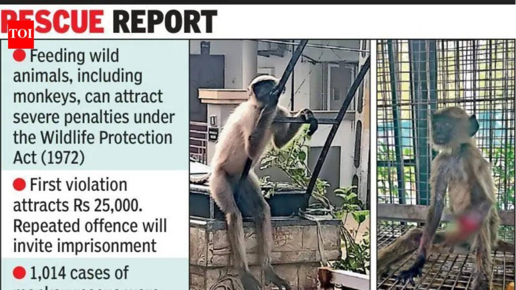 Ahmedabad: Tossing fruits, biscuits and leftovers to monkeys and langurs near temples, housing societies and open grounds was once seen as routine or even charitable. However, with rising incidents of human-animal conflict, it may no longer be seen as a harmless act. The Gujarat forest department has begun cracking down on the practice, warning that it will now be treated as a violation under the Wildlife Protection Act.The department has now stepped up awareness drives along with enforcement. A first offence of feeding monkeys or langurs can attract a fine of Rs 25,000, while repeated violations may lead to imprisonment. Rescue teams have also been asked to closely monitor behaviour in areas where aggression is increasing.Officials say the situation has moved beyond a nuisance and become a public safety concern. In Ahmedabad, many emergency calls now involve monkey bites, attacks or monkeys entering homes in search of food.Casual feeding has altered animal behaviour, leading to a growing wildlife challenge in urban spaces, say experts. Instead of passing through the city occasionally, monkeys have begun setting in empty plots, tree-lined colonies and neglected grounds, increasing daily contact with humans and raising the risk of conflict.The scale of the problem is evident in official data. During the Dec 2024 census, Ahmedabad’s monkey population was recorded at 4,602, nearly double compared to five years earlier. have gradually turned into regular habitats for primates.The forest department has identified 198 locations across the city where monkey and langur presence is a recurring issue. Areas such as Vastrapur, Navrangpura, Thaltej, Bopal, Ghuma, Ambawadi, Paldi, Shahibaug, Chandkheda, Kubernagar, Naroda, Narol, Sabarmati, Bilasiya, Maninagar, and Asarwa are among the worst-affected.In some pockets, the situation has turned alarming. Chanakyapuri alone reported 20 incidents of monkey bites. Across the city, around 40 bite cases are being reported every month. In Gomtipur, authorities recently launched an operation to capture a monkey after it bit 12 people within five days.Officials say feeding is a key trigger behind this behaviour. Under the Wildlife Protection Act, 1972, amended in 2022, monkeys and hanuman langurs are protected under Schedule II. Feeding them is legally treated as baiting, which is considered a serious offence. “Feeding encourages dependence and aggression, which leads to more conflict situations,” said Minal Jani, deputy conservator of forest, Ahmedabad.The change is also visible in rescue operations. The Human-Langur Interaction Survey revealed the scale of the challenge. Data from the Wildlife Rescue Centre in Ahmedabad shows 1,014 langur-related rescue cases between Jan 2025 and Dec 2025. In just the first two-and-a-half months of 2026, from Jan 1 to March 15, another 70 rescues were recorded from 33 locations.Residents say the impact is being felt daily. Social worker Harshad Patel from Amraiwadi said that his society alone reported more than five incidents of bites or property damage in six months.