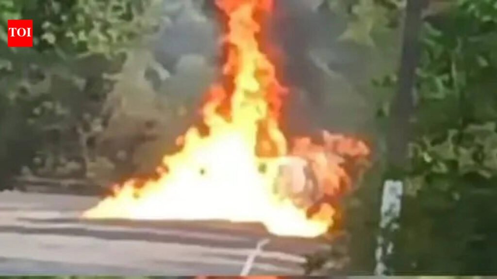 Karwar: A tanker carrying chemicals burst into flames after a powerful explosion on NH-52 in Uttara Kannada district, leaving the vehicle completely gutted.The incident happened near Kanchinabagilu in Ankola taluk. The blast was so intense that the tanker was soon engulfed in raging flames, with thick smoke and fire, making it impossible for anyone to approach the site.Authorities are worried about the tanker driver, as there has been no sign of him. As a safety measure, traffic on the busy Ankola-Hubballi stretch of NH-52 was halted, leading to vehicle pile-up. Local police and fire personnel rushed to the spot to bring the situation under control. The exact cause of the explosion is still not known, and officials said details are expected soon.