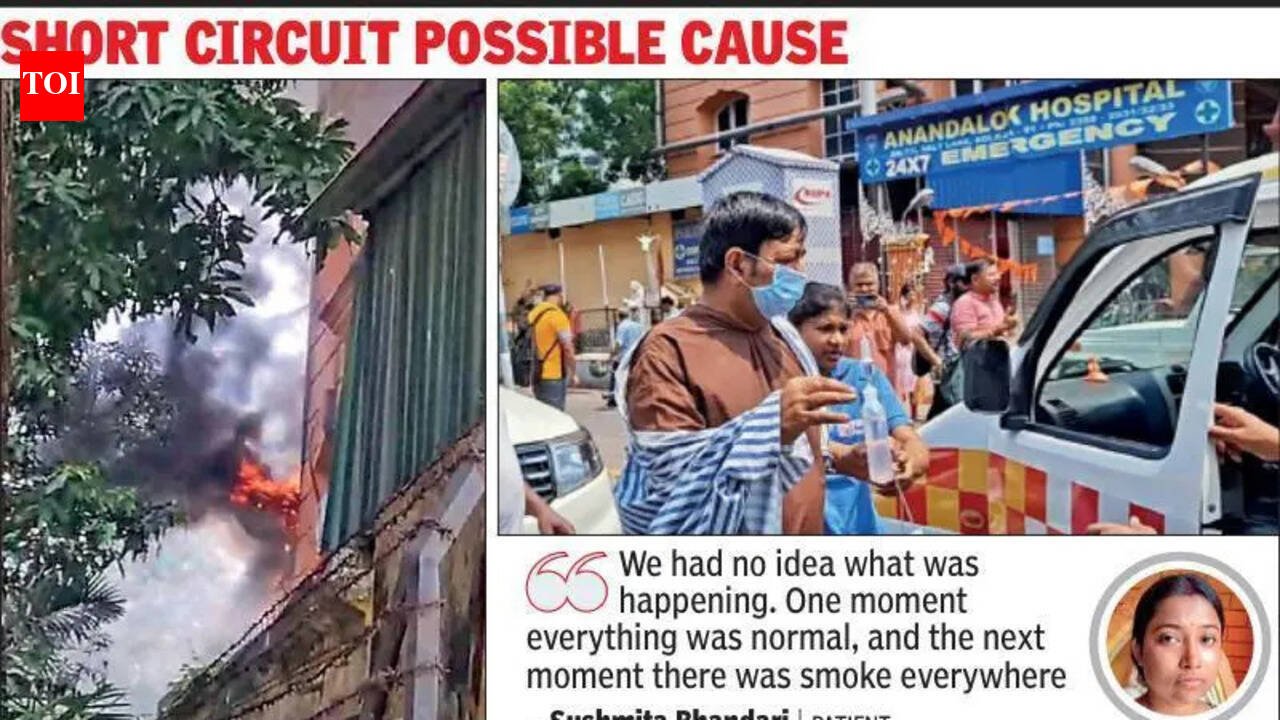 Kolkata: Surgeries halted midway and patients inside operation theatres and wards were wheeled out on stretchers and wheelchairs after a fire broke out inside the second-floor cathlab of Anandalok Hospital on Tuesday morning, triggering panic and an emergency evacuation in the middle of critical procedures.The blaze, reported started around 10 am at the hospital near Karunamoyee in Salt Lake. It quickly escalated as thick black smoke engulfed corridors and parts of the building. Flames gutted a portion of the cathlab and sections of the operation theatre before firefighters brought the situation under control. No injuries were reported.According to officials, three fire tenders rushed to the spot and began operations on a war footing. Firefighters battled dense smoke billowing from the second floor, even as hospital staff scrambled to evacuate patients from wards and operation theatres. Authorities said all floors were being checked thoroughly to ensure no one remained trapped.“There were 13 scheduled surgeries today. We had just completed the sixth surgery – a gall bladder stone removal operation – when the fire alarms went off. We came out of the OT on the third floor and we could see smoke billowing from the floor below us. We immediately removed all patients from the OT and other affected wards out of the hospital,” said Sanjay Gupta, a general surgeon.Hospital staff said the evacuation was carried out swiftly despite the chaos.Sanjukta Jhajharia, secretary of Anandalok Hospital, said: “Our fire-fighting system was apt and we operated on a war footing. We undertake regular fire drills. We had around 50 in-house patients. There were another 70-odd patients in the outdoor unit. We had enough security personnel in place who evacuated all of them out of the building to our annexe building right behind the hospital.”Officials alleged even as the firefighters arrived later than usual, the in-house staff removed the patients by themselves without causing any harm to any of them.“Flames could be seen from one of the windows on the second floor and the fire alarm had started ringing. Within minutes, the entire area was covered with smoke,” said Dolly Roy, a clerical staff member of the hospital. “Our staff started breaking open the glass windows to let the smoke out.Several patients and their relatives were later seen sitting on the road outside the hospital, visibly shaken after the sudden evacuation. Officials said the main building was shut after the fire and that it would reopen after completion of forensic officials and a green signal from police and fire dept.Cops confirmed that the hospital had been fully evacuated. Preliminary findings by the fire dept suggest an electrical short circuit in the air-conditioning system inside the cathlab or operation theatre may have triggered the blaze. “The fire was confined to just one room,” the official said.