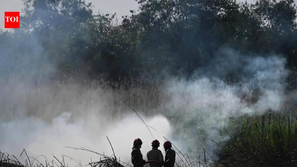 New Delhi: A fire broke out in a forested patch near Rajghat bus depot on Sunday, engulfing nearly 25 acres of land.Over 50 firefighters battled the blaze across multiple points, working to prevent it from spreading further in the dry and densely packed foliage.The dense jungle made it difficult for fire tenders to access certain pockets of the affected area.Police said the blaze was brought under control and no injuries were reported.