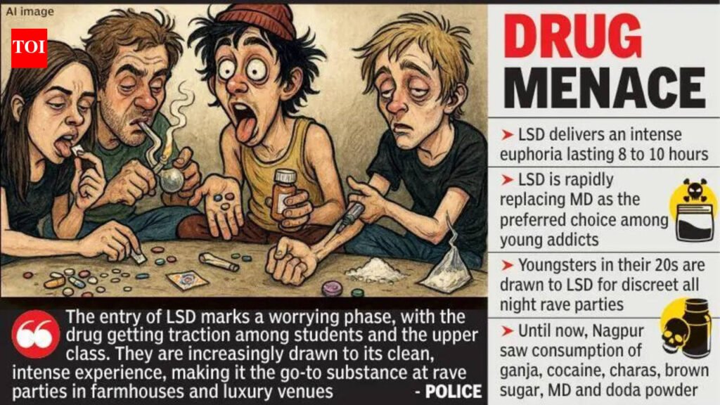 Nagpur: An LSD consignment valued at Rs 1.7 lakh was seized on Friday, marking Nagpur’s first-ever bust of the powerful hallucinogen and signalling a dangerous shift from MD to acid-trip. Seventeen LSD dots came wrapped in perforated sticker sheets priced between Rs 1,500 and Rs 1,800 each, said police.Code-named ‘million tree’, the seizure from two computer engineering students from a reputed college triggered intense police raids across the city. Sources said, LSD is rapidly replacing other synthetic stimulants as the preferred choice, particularly in elite campuses and upscale rave parties.Acting on a tip-off from a constable Raj Choudhary, a joint team of MIDC police, crime branch, anti-narcotics and bharosa cell units intercepted two students near Jaitala. A woman cop posed as a decoy customer before senior cops zeroed in on suspects. While the peddler managed to flee, students got trapped inside their apartment when cops moved in.Known as ‘last stage drug’ in local parlance, LSD triggers intense euphoria lasting 8-10 hours, said an insider. “Users place the tiny sticker on the roof of the mouth and chew for an immediate psychedelic effect,” he said, adding many youngsters from Jaripatka, Wardhaman Nagar, Khamla, Lakadganj, Civil Lines, Byramji Town and surrounding areas are suffering from addiction and acute withdrawal symptoms.Police sources confirm that till now Nagpur primarily witnessed seizures of ganja, cocaine, charas, brown sugar, MD and doda powder. “The entry of LSD marks a worrying phase, with the drug getting traction among students and the upper class. They are increasingly drawn to its clean, intense experience, making it the go-to substance at rave parties in farmhouses and luxury venues,” said a police official.Police commissioner Ravinder Singal said, ‘Operation Thunder’ has entered a new dynamic phase in the crackdown against drugs. The strategy combines intelligence-based operations, technology-driven surveillance, campus monitoring, youth awareness campaigns and community participation.