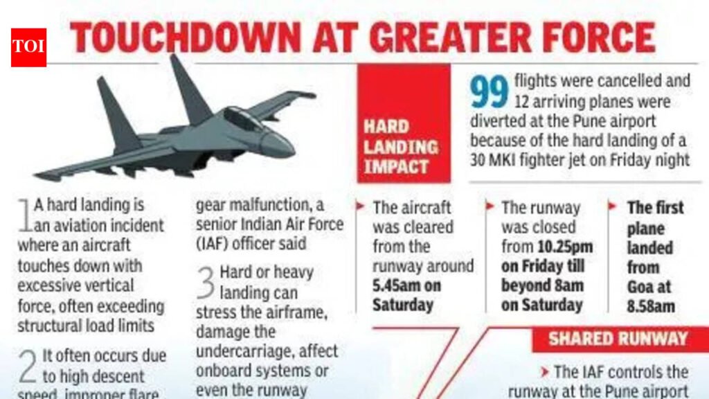 Pune:The cancellation of 99 flights and diversion of 12 arriving planes at the Pune airport because of the hard landing of a Sukhoi 30 MKI fighter jet on Friday night left thousands of flyers stranded, compelling them to take a patience test for hours amid confusion.Some stood in long queues for a refund or rescheduling on Saturday morning. A few undertook rigorous journeys after spending a hefty sum for new tickets.The Pune airport’srunway was closed from 10.25pm on Friday till beyond 8am on Saturday. The first plane landed from Goa at 8.58am. The first departure was to Delhi at 9.17am.“Flight operations have now returned to normal. Airlines have coordinated with passengers regarding delays, cancellations, and diversions,” Pune airport director Santosh Dhoke said.Flyers were hassled beyond limits because of the unforeseen disruption in flight operations. Rahoul Nagdda, booked on a flight on Saturday morning to Delhi and then to Srinagar, stood in a queue for about four hours to reschedule his flight.”I had reached the airport by 5am for my 7.30am flight. There was total chaos at the facility. After almost an hour, we came to know that the flight was cancelled. The airline should have sent an intimation earlier.”Nagdda, along with many other flyers, stood in the queue from 6.30am to 10.30am to reschedule the flight. “Authorities claimed that flight operations resumed by 8am, but I didn’t see any take-offs till 9am,” the NIBM Road resident said.Agha Mesaam Hyder had landed from Bhubaneswar in Pune on Friday afternoon. He had a connecting flight to Bhopal at 1am on Saturday.“The ‘silent’ airport turned chaotic around 10.30pm on Friday. IndiGo staffers told me that there was a problem on the runway and I could cancel my flight or reschedule it. I found just one option — go to Mumbai, take a flight from Mumbai to Ahmedabad and from there to Bhopal. I reached Mumbai airport in a cab and landed in Ahmedabad at 8am on Saturday. I had to book a hotel because my onward flight to Bhopal is around 3.30pm. I am slated to reach home by 8pm if everything goes well,” he toldTOIon Saturday afternoon.Magarpatta’s Joy Abraham said, “My flight from Chandigarh to Pune was scheduled at 10.50 pm. I got a message that the flight was delayed around 7pm, after I started for the airport. The delay kept increasing in 30-minute blocks. There was an announcement that the Pune airport was not available for landing because of a technical situation. There were roughly 150 to 170 passengers waiting. Around 1am, the flight was finally cancelled. While IndiGo provided basic refreshments and the ground staff mentioned about accommodation, it was not provided at the counter.”He said, Fares jumped significantly after the cancellation of the Pune flight. I booked a morning Air India flight to Mumbai spending Rs.19,000. From there, I took a taxi to Pune, which took another four hours. Overall, the lack of clear communication and limited support made the situation difficult for passengers.”A woman and her daughter from Kothrud, supposed to fly to Bengaluru and then to Sydney, found themselves in a spot on Saturday. “The flight to Bengaluru at 10.30am got cancelled. My wife and daughter had reached the airport around 4am and were stranded there for hours. Now, we have been able to reschedule the entire trip,” the husband of the stranded woman said, requesting anonymity.