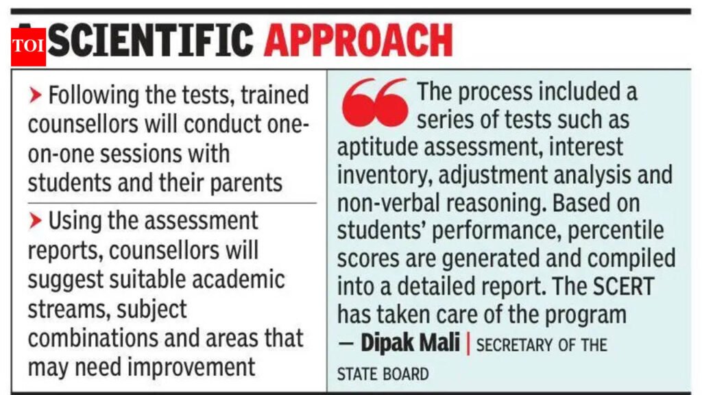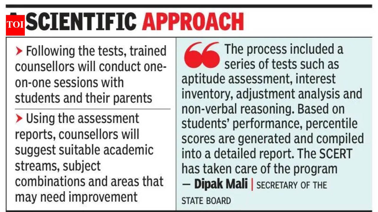 Pune: The state education department will begin free psychological assessments and counselling sessions for secondary school certificate (SSC, Std X) students from Monday.The programme has been designed to help students make informed academic and career choices after their board examinations. With over 16 lakh students appearing for the SSC examsthis year, officials said many students and parents struggle to decide between junior college streams and skill-based education pathways.To address this, the department, in collaboration with the State Council of Education Research and Training (SCERT), has rolled out a structured guidance programme based on scientific assessment tools.Dipak Mali, secretary of the state board, told TOI, “The process included a series of tests such as aptitude assessment, interest inventory, adjustment analysis and non-verbal reasoning. Based on students’ performance, percentile scores are generated and compiled into a detailed report. The SCERT has taken care of the program.”“The objective has been to provide clarity at a crucial stage of a student’s academic journey. These assessments help identify strengths, interests and potential career paths. The initiative will empower students with a right direction and confidence before they step into the next phase of their education,” Deepali Jogdande, official incharge at SCERT, told TOI.Following the tests, trained counsellors will conduct one-on-one sessions with students and their parents. Using the assessment reports, counsellors will suggest suitable academic streams, subject combinations and areas that may need improvement.“Parents are equally involved in the counselling process so that decisions are taken with a clear understanding of the child’s abilities and aspirations. This ensures that students do not feel pressured or confused while choosing their path,” said Mahesh Lakde, a teacher from a city-based school whose capacity building training was conducted by the SCERT.Officials added that the initiative also helps students identify at least two possible academic trajectories aligned with their capabilities, while making them aware of their limitations.