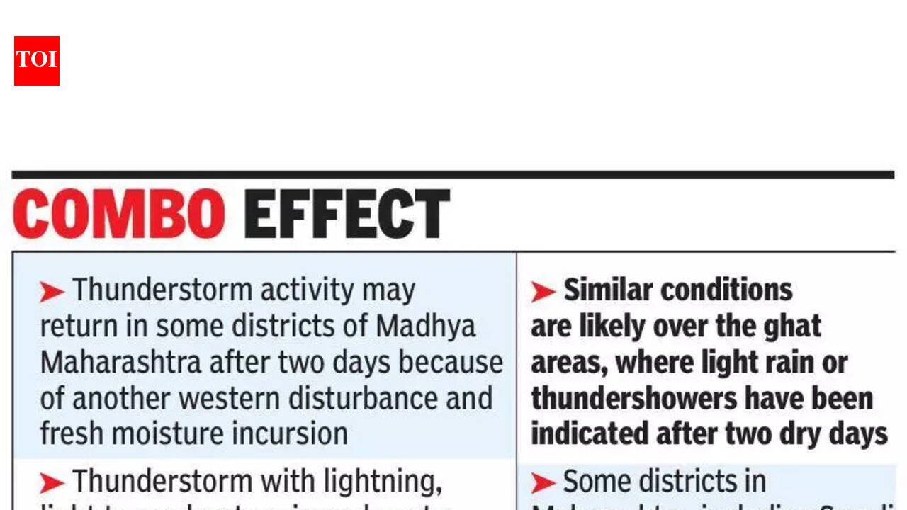 Pune: A fresh spell of rain and gusty winds are likely in parts of the state from Monday, preventing a sharp rise in day temperatures next week.According to India Meteorological Department (IMD)’s latest district-level forecast, maximum temperatures are expected to rise by 2-4°C over Konkan, Madhya Maharashtra and Marathwada over the next two days, while minimum temperatures may increase by 2-3°C during the next 24 hours. Maximum temperatures may rise by 3-5°C during the next five days in Vidarbha before stabilising, while minimum temperatures are likely to remain largely unchanged.IMD scientist SD Sanap said the earlier favourable conditions for thunderstorms had weakened and there would be a temporary rise in temperatures in the next couple of days. “The easterly trough bringing moisture has weakened and the western disturbance influence has reduced, so temperatures will rise for the next couple of days. Model guidance shows another western disturbance and fresh moisture incursion. Thunderstorm activity may return in some districts of Madhya Maharashtra after two days because of these,” he said.Sanap said temperatures in Pune were not expected to rise sharply. “We are not expecting very high day temperatures over the next four to five days. Values should remain close to normal, and pre-monsoon showers may occur in isolated pockets, which can cause local variations even within the same district,” he said.According to the IMD forecast, thunderstorm activity with lightning, light to moderate rain and gusty winds of around 30-40kmph are likely in parts of Madhya Maharashtra, including Pune, Satara, Sangli and Solapur districts, around March 23-24. Similar conditions are likely over the ghats areas, where light rain or thundershowers have been indicated after two dry days.The forecast shows that some districts in Maharashtra, including Sangli and Solapur, have higher chances of thunderstorms on multiple days, with winds reaching up to 40-50kmph at isolated locations.IMD officials said such brief spells of pre-monsoon rain were typical during March, when western disturbances and easterly troughs interact to bring moisture into the region, leading to isolated thunderstorms rather than widespread rainfall.