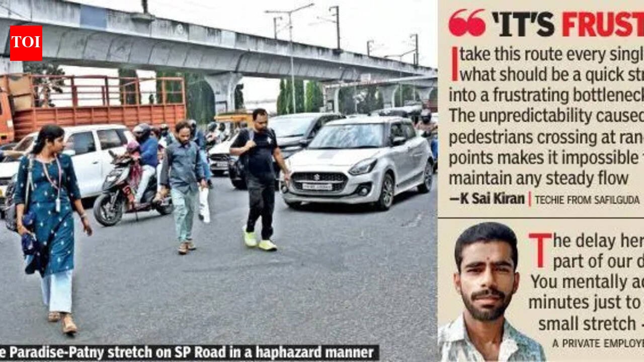 Hyderabad: Commuters travelling between Marredpally St John’s signal and Begumpet are facing frequent delays along a key Secunderabad corridor. Unregulated pedestrian crossings between the Patny and Paradise flyovers are disrupting the smooth flow of traffic. A stretch that usually takes about five minutes to cover now often takes 15–20 minutes. The delays are even longer during peak hours.The congestion is concentrated at the exit ramp of the Patny flyover and the entry ramp of the Paradise flyover. At these points, a steady stream of pedestrians cross the road throughout the day, slowing vehicles and causing frequent stoppages. The absence of designated pedestrian infrastructure has created a situation where motorists and pedestrians compete for the same space, reducing the efficiency of the flyover system. Thousands of commuters, including office-goers, students, and public transport users, pass through this stretch daily.‘Truly exhausting’Traffic movement becomes particularly sluggish during morning and evening rush hours, when both vehicular and pedestrian volumes rise simultaneously. The resulting bottlenecks often extend beyond the ramps, affecting adjoining roads and increasing travel time across the corridor.Kothapally Sai Kiran, a tech professional from Safilguda who travels daily to Hitech City, described the experience as increasingly difficult. “I take this route every single day, and what should be a quick stretch turns into a frustrating bottleneck. The unpredictability caused by pedestrians crossing at random points makes it impossible to maintain any steady flow. It’s exhausting, especially after a long workday,” he said.Mamidi Santosh, a private employee working in Begumpet, highlighted the routine nature of the delays. “The delay here has become part of our daily routine. You mentally add 15–20 minutes just to get through this small stretch. Even when traffic seems clear on the flyover, everything comes to a halt near the ramps because of constant pedestrian movement,” he noted.‘No other alternative’Pedestrians using the same stretch pointed to the lack of safe crossing options. One pedestrian near the Paradise flyover said, “We don’t have a proper place to cross safely. There are bus stops and shops on both sides, so people naturally try to cross wherever possible. It’s risky for us, but there’s no alternative.”Another pedestrian described peak-hour conditions as difficult to navigate. “During peak hours, it becomes chaotic. Vehicles don’t stop fully, and pedestrians hesitate midway. Everyone is trying to move at the same time, which creates confusion and slows down both traffic and foot movement,” the person said. Begumpet Traffic CI G Janaki Ramulu told TOI, “The primary cause of congestion in this stretch is pedestrians crossing the road at multiple points. To manage the situation, we have deployed constables on both sides to regulate movement and are facilitating pedestrian crossings in groups of around 15 at a time. We have also been consistently proposing to GHMC the construction of a foot overbridge, which we believe is the only permanent solution to the issue.”With commercial establishments, public transport access points, and residential areas along Parklane, pedestrian movement in the area remains high throughout the day. In the absence of grade-separated infrastructure, the conflict between foot traffic and vehicular movement continues to affect travel time and road usage efficiency along this busy stretch.