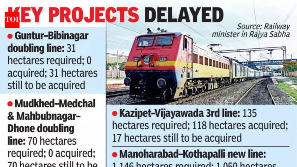 Hyderabad: Land acquisition delays and funding gaps have stalled several key railway infrastructure projects in Telangana, significantly affecting the pace of rail development in the state.According to data from the Ministry of Railways, crucial doubling works on important rail corridors have made little progress due to a lack of land acquisition. For the Bibinagar–Guntur doubling line, a key corridor connecting Hyderabad with Chennai and Kerala, not a single hectare has been acquired out of the 31 hectares required for the project.A similar situation exists with the Mudhked–Medchal–Mahabubnagar–Dhone doubling line, where none of the 70 acres required has been acquired. Overall, Telangana requires nearly 770 hectares of land to complete the ongoing railway development projects in the state.The ministry reported significant delays in the handing over of land and the sharing of project costs by the govt of Telangana in relation to the Manoharabad–Kothapalli railway line, which spans 151 km. This has adversely affected the execution of the project. To date, the project has been commissioned only up to Siddipet.Most of these projects were sanctioned on a cost-sharing basis between the Centre and the state govt, with a total estimated cost of 4,704 crore. Telangana’s share in these projects amounts to 2,181 crore. Under the agreement, the state govt was required to deposit 1,708 crore with the Ministry of Railways. However, only 894 crore has been deposited, leaving a shortfall of 814 crore, which railway officials say is adversely affecting the progress of the projects.Hyderabad: A total of 20 railway projects, including six new lines and 14 doubling works, covering a total length of 2,166 km and costing 35,045 crore, either fully or partly in Telangana, have been sanctioned. Out of this, 548 km has been commissioned, with an expenditure of 11,550 crore having been incurred.tnn