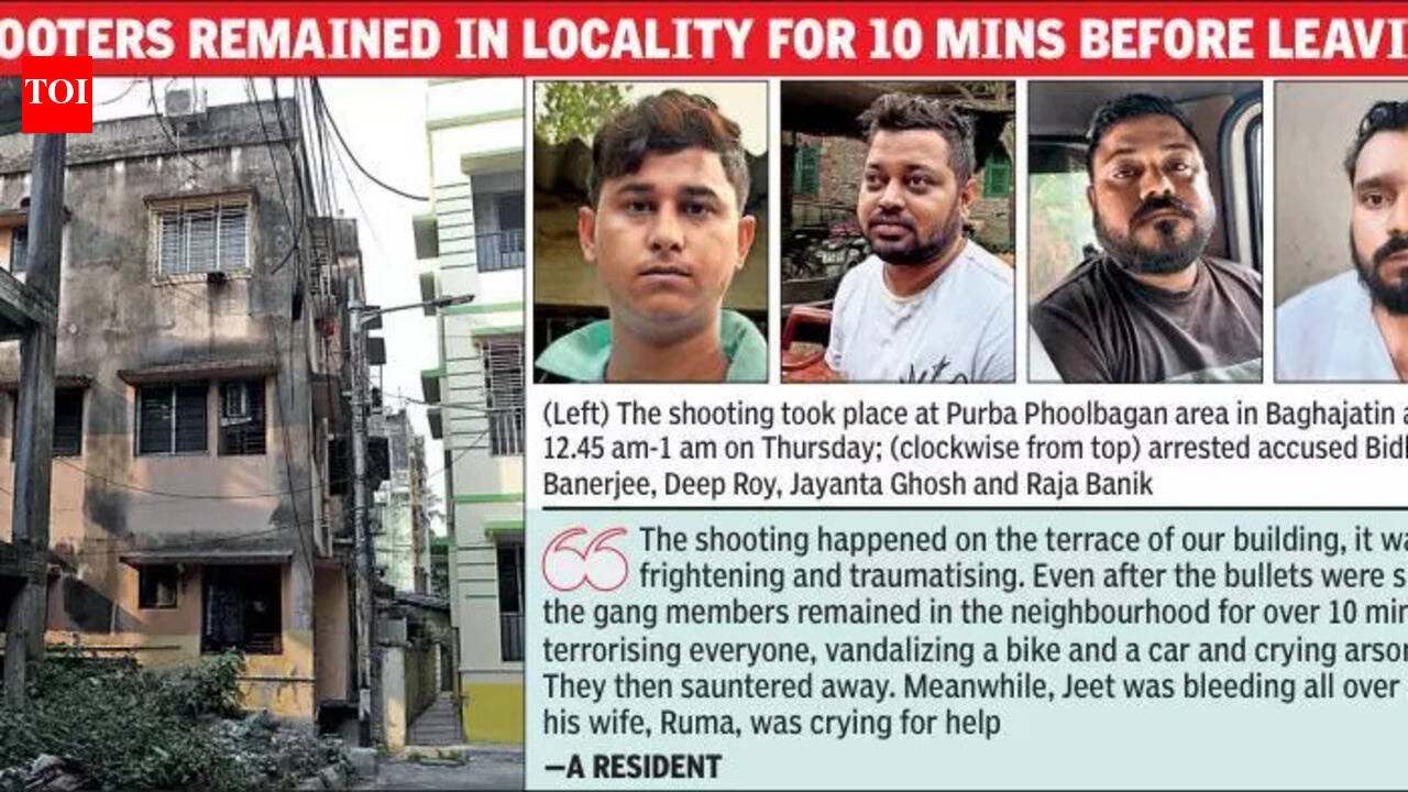 Kolkata: What residents of Purba Phoolbagan area in Baghajatin initially assumed to be late-night celebrations with firecrackers shortly turned out to be gunshots. Familiarity with political violence notwithstanding, the shooting around 12.45 am-1 am on Thursday shook up residents, who said it felt like watching a scene out of a Hindi potboiler. “It is not only about a murder but how it was committed. The shooting happened on the terrace of our building, it was frightening and traumatising. Even after the bullets were shot, the gang members remained in the neighbourhood for over 10 minutes, terrorising everyone, vandalizing a bike and a car and crying arson. They then sauntered away. Meanwhile, Jeet was bleeding all over and his wife, Ruma, was crying for help,” said a resident, who along with his daughter, watched police proceedings on Thursday morning. Four persons have been arrested.Soma Dutta, who lives in the neighbourhood, was jolted out of sleep by the loud bangs, which she mistook for that of firecrackers. As she and her husband peeped out of the window, they realised it was a shooting. “Five to six shots were fired one after the other. As we looked out of the window, we saw six men around the entrance of our building. They vandalised Jeet’s bike and then, turned their attention to his car. It seemed they wanted to set everything on fire,” Dutta told TOI on Thursday. “We were worried about our car, which my husband parked outside as Jeet and his friends had kept their bikes in our garage slot.” Another resident, Kabita Dasgupta, told TOI Jeet’s wife, their small daughter in tow, began banging on neighbours’ doors, crying for help to save Jeet and his friend, Rahul Dey. “These residents mustered courage and came forward to help. On seeing people coming out of their homes, the accused gang walked away though they neither showed fear nor repentance. They walked to a distance and then, rode away on their bikes,” she said.Most in the neighbourhood seemed to be aware of Jeet’s criminal records. “But he has a different image in the locality. He and Rahul, who lived in Chatterjee Colony, would always be there for people. Recently, Jeet played a crucial role when a fire broke out here. He also used his political connections to help people out with the state welfare schemes,” said Abhijit Dutta, a resident.But not all were impressed with Jeet’s image. “He is not exactly a role model. He holds parties at odd hours, usurps garage space, but no one dares to protest, given his political clout,” said a resident .Political members, including Trinamool Jadavpur aspirant Debabrata Majumdar and CPM nominee Bikash Ranjan Bhattacharya visited the place in the morning. Residents demanded that CCTV cameras be installed in the area immediately, pointing out multiple meetings with the administration yielded no result. Police also found most CCTV cameras in nearby areas broken, including the one at the KMC Ward 101 office.