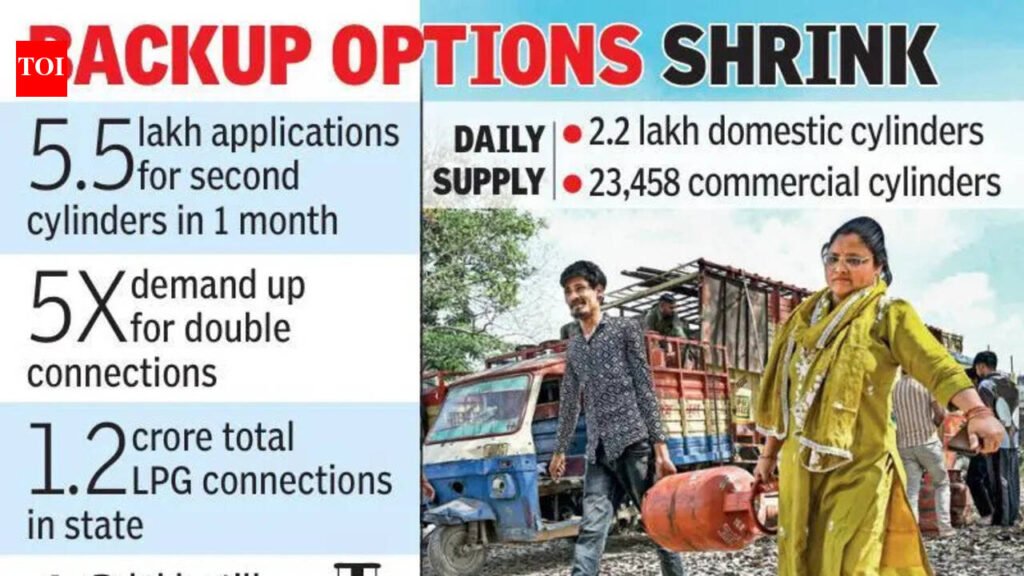 Hyderabad: A sharp surge in cooking gas demand and supply disruptions linked to the Iran conflict have forced LPG agencies across the state to freeze second cylinder requests and halt new connections, leaving thousands of households scrambling for fuel. Families dependent on a single cylinder are now bearing the brunt of the shortage.Officials said vigilance teams have been formed to curb black market sales and ensure cylinders reach genuine consumers. With fresh supplies taking up to a month when an existing cylinder runs out, consumers have rushed to apply for second cylinders as a backup. Applications for double cylinder connections have jumped fivefold over normal levels. But agencies, citing severe pressure and lack of storage space, have put new requests on hold. In the last month alone, around 5.50 lakh people reportedly applied for second cylinders through three distributors. Dealers said approving double cylinder requests during the shortage would worsen the crisis, as consumers would immediately book additional refills. “We have just returned to the normal in clearing the regular bookings. Anything above this, it may not be possible. Double cylinder and new connections will be restored only after further instructions,” said K Jagan Mohan Reddy, Telangana LPG dealers association president. The state has 1.28 crore domestic LPG connections, of which 68 lakh are single cylinder users and 60 lakh have double cylinder connections. This means nearly 60% of consumers still depend on just one cylinder. Waiting period 25 daysBefore the conflict, consumers could book another cylinder 15 days after receiving one. Now, the waiting period has stretched to 25 days in urban areas and 45 days in rural areas. Delivery after booking is taking another seven to 11 days. Large families say one cylinder is no longer enough, forcing some to turn to the black market. Others are applying for fresh connections in the names of family members. Demand from newly separated families, students and migrant workers has also doubled. IOC, HPCL and BPCL operate through 810 agencies across 33 districts, supplying 2,25,981 domestic cylinders and 23,458 commercial cylinders every day.