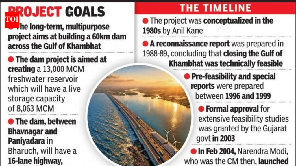 Gandhinagar: The Gujarat govt, along with the Centre, is likely to tie up with the Netherlands to develop the ambitious Kalpasar project. Conceived about four decades ago, it has still not taken off, despite a series of detailed project reports (DPRs) having been commissioned. According to the latest estimates, the total cost of the Kalpasar project has been pegged at Rs 1.57 lakh crore.The project envisages the creation of a 13,000 million cubic metre (MCM) freshwater reservoir in the Gulf of Khambhat by constructing a 60km dam between Bhavnagar and Bharuch. A 16-lane highway at the top of the dam will connect Saurashtra to South Gujarat, drastically reducing travel time between the two regions, while the freshwater stored in the reservoir will meet drinking water, irrigation, and industry needs.Top sources said that the Gujarat govt and the Centre are exploring the possibility of a strategic G2G (govt-to-govt) partnership, and development of a business model for the Kalpasar project. “A team of Dutch representatives met CM Bhupendra Patel and officials of the state administration earlier this week in Gandhinagar, where a presentation on the Kalpasar project was made,” a source said.“A proposal was mooted for the creation of an Indo-Dutch expert group for periodic design review, knowledge transfer and other aspects of partnership for development of the Kalpasar project,” the source added. Official sources said that, like the Narmada project, the Kalpasar project is proposed to benefit multiple states. “As far as Gujarat is concerned, the current per capita per year water availability in the state is 920 cubic metres, which is 54% of the adequate requirement of 1,700 cubic metres per capita per year. With no new water sources available, the water availability situation will become critical by 2047, and hence a decision has been taken to expedite the project,” a source told TOI.According to details provided by the state govt, an estimated 30,000 MCM of water flows annually into the sea without being stored. “A sustainable solution is essential to address future water requirements of the state, considering factors such as rapid industrial development and a growing urban population. With rapid improvement in urban living standards, the demand for water will continue to rise,” the source said.A number of rivers — Sabarmati, Mahi, Dhadhar, Narmada (via Diversion Canal), Wadhvan Bhogavo, Limbadi Bhogavo, Sukhbhadar, Utavali, Keri, Ghelo and Kalubhar — empty into the Gulf of Khambhat in the proposed area of the Kalpasar project.Regarding the studies conducted so far for the project, officials said that about 20 renowned national and international organisations have been engaged for their services, and to date, 51 studies have been completed and three are in progress. “These remaining studies are expected to be completed by June 2028,” an official said.
