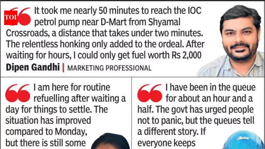 Ahmedabad: Petrol sales in the state more than doubled in a single day on Monday, driven by panic refuelling triggered by rumours of a shortage. The rush spilled over into Tuesday as well. While queues shortened marginally through the day, most petrol pumps continued to witness heavy footfall.Estimates by oil companies suggest that on March 23, fuel sales remained normal through the morning before surging sharply after 2pm. State-wide petrol sales rose to 17,798 kilolitres (kl) against an average daily sale of 8,150 kl, an increase of 118%, while diesel sales increased to 26,935 kl compared to the usual 16,120 kl, an increase of 67%. In Ahmedabad, major rush was reported at fuel stations in Gulbai Tekra, Shivranjini, Jodhpur, Anandnagar Road, Prernatirth Derasar Road, Mithakhali, Prahladnagar and Navrangpura, among others, throughout Tuesday as well. Though the intensity of queues reduced on Tuesday, the rush had not fully subsided, with serpentine queues forming outside petrol pumps.“Having made two trips to a fuel station near my office in Ambawadi, I ended up waiting almost 40 minutes to refuel my car. I had no intention of going to the fuel station during such rush hours, but due to a few work trips during the day, my car ran out of fuel, and I had no choice,” said Bankim Banerjee, a professional.The frenzied buying also led to major traffic snarls across several road stretches with fuel stations. At the outlet level, the spike was even sharper. Several petrol pumps reported sales of four to five times their daily average volumes. “The majority of customers are asking for full-tank refills, anticipating an impending shortage purely based on rumours. The staff is hassled as a result. If this continues, any petrol pump could run dry, which may further fuel panic,” said Padmajay Rathod, a petroleum dealer from Ahmedabad.Public sector oil companies also reiterated that supply remains robust. “Our average daily petrol sale in Gujarat is 3,000 kilolitres per day. But on Monday, our fuel stations across the state sold 7,917 kilolitres of petrol as the demand suddenly shot up due to the rumours of fuel shortage,” said Sanjib Kumar Behera, executive director and state head of state-level coordination committee for PSU oil companies in Gujarat. “There is adequate pipeline stock, and refineries are operating at full capacity. Our staff are working round the clock to ensure uninterrupted supply and to reassure consumers that there is no shortage,” Behera added. Industry officials said the surge was entirely driven by precautionary buying, warning that such behaviour — rather than any real supply constraint — risks creating temporary localized shortages.Other cities continue to see rushTushar.TereVadodara/Rajkot: Serpentine queues of vehicles and impatient honking were commonplace across Vadodara on Tuesday as panic buying of fuel continued for the second consecutive day despite repeated assurances from the govt.Even as the district administration urged people not to panic, crowds continued to throng fuel stations. At some pumps, attendants were forced to ration supply.Queues began swelling late on Monday night itself. By Tuesday morning, office-goers once again crowded pumps.Anxiety deepened as several of the city’s 163 fuel stations temporarily shut after running out of stock. “Around 30% of the fuel stations in the city were closed, but their stocks will be replenished soon,” said Mehul Patel, president of the Federation of Gujarat Petroleum Dealers Association.In Rajkot, the rush eased compared to Monday, though many fuel stations continued to witness queues and heavy sales.(with inputs from Tejaswini Kumawat)
