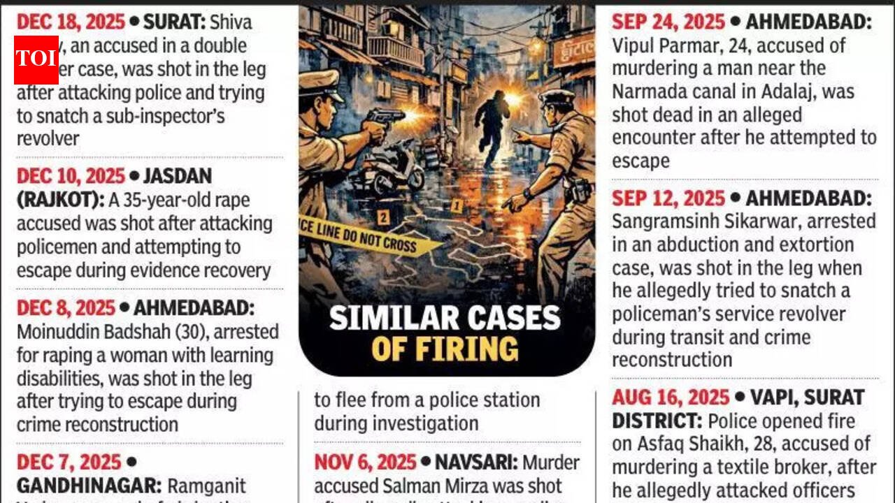 Ahmedabad: An accused wanted in a Gujarat Control of Terrorism and Organised Crime (GujCTOC) Act case was shot in the arm by the state monitoring cell (SMC) team after he allegedly attempted to escape from police custody near Shamlaji in Aravalli district on Friday. The accused, Sukhlal Dangi, a 37-year-old resident of Dhasa in Rajasthan’s Udaipur district, was injured in the firing and later admitted to Himmatnagar Civil Hospital for treatment.Police said Dangi, also known as Shakaji Dangi, was brought to Gujarat from Rajasthan after being arrested by the SMC in connection with a GujCTOC case linked to organised prohibition offences. During the transit near Shamlaji, the accused allegedly tried to flee and attacked the police personnel escorting him, prompting the team to open fire in self-defence.According to officials, inspector Bhavesh Rathod warned the accused before firing a round that struck Dangi on his right bicep. The accused was first taken to the Shamlaji Community Health Centre (CHC) and later shifted to Himmatnagar Civil Hospital for further treatment.Hospital sources said Dangi was brought to the emergency department around 1.08pm on Friday. Medical exams, including an X-ray and sonography, were conducted. Doctors found a 2.2cm entry-exit wound around 10cm above the elbow on his right arm. His condition is stated to be stable, and he remains under medical observation.Officials said a police constable sustained minor injuries during the scuffle with the accused before the firing incident.Superintendent of Police (SMC) Mayur Chavda said that Dangi has a long criminal record and is involved in 36 prohibition-related offences. He was also a wanted accused in a GujCTOC case being investigated by the SMC.“An SMC team went to Rajasthan to apprehend him. He was arrested in Udaipur and was brought to Gandhinagar when he attempted to strangle the vehicle driver, causing the police vehicle to nearly meet with an accident,” Chavda said.“In that situation, one of the policemen fired a round which hit him in the right bicep,” he added.Police registered an attempt to murder case against Dangi for allegedly attacking the police team during transit.Following the incident, tight security was deployed at Himmatnagar Civil Hospital, where the accused is undergoing treatment under police guard. Officials said he will be taken into custody for further interrogation once discharged from hospital.