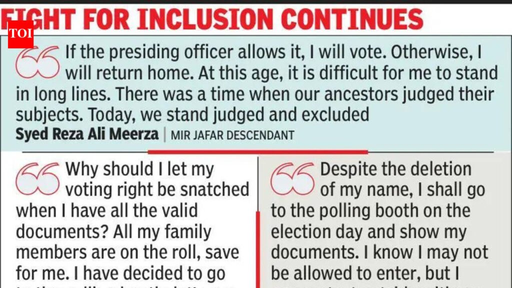 Kolkata: With tribunal appeals unlikely to conclude before polling, the descendants of Mir Jafar, along with thousands of voters whose names have been deleted from the electoral roll, are determined to register their protest by appearing at the polling stations on election day, documents in hand, to challenge their exclusion. On poll day, Syed Reza Ali Meerza — a 15th-generation descendant of Mir Jafar — will walk to his booth carrying all his documents, hoping for a chance to vote. “If the presiding officer allows it, I will vote. Otherwise, I will return home,” said the visibly disheartened ‘Chhote Nawab’. Just days ahead of the elections, Meerza told TOI that he had little hope left of voting this year after his name was removed from the electoral roll. Among those deleted is his son, Syed Mohammad Fahim Meerza, a Trinamool Congress councillor from Ward 10 of Murshidabad Municipality. The family claims that nearly 346 voters — many belonging to the Nawabi lineage — were struck off from Booth 121 at Nava Adarsha High School in Lalbagh. The octogenarian said that while district magistrate and district election officer R Arjun informed him that restoration now lied solely with the tribunal, the daunting queues and limited time make the process appear impossible. “At this age, it is difficult for me to stand in long lines,” he said from his residence at Qila Nizamat.The family members maintained that they submitted all required documents and attended every hearing. Many expressed shock, noting their names had appeared in electoral rolls for decades, including the 2002 SIR rolls. Calling the situation deeply ironic, Meerza said: “There was a time when our ancestors judged their subjects. Today, we stand judged and excluded.” This sentiment of defiance is echoed across the state by other “axed” voters who refuse to stay home on poll day. Sixty-year-old Kalabati Devi, who has lived on Alipore Road for four decades, is adamant about appearing at her booth on April 29. “Why should I let my voting right be snatched when I have all the valid documents? All my family members are on the roll, save for me. I have decided to go to the polling booth; let’s see what happens,” she said.Similarly, Sanjay Bohra of Bentinck Street called the process “extremely illogical”, alleging that voters may have been targeted by their surnames. “I have a valid voter ID and a passport proving my citizenship. I will go to the polling booth and ask why I was kept out,” Bohra asserted. In the Sealdah area, 23-year-old Priyangsu Paul expressed disappointment after being told a “spelling mistake” led to his deletion despite submitting correct certificates. “Even if my appeal is not cleared, I will still go to the polling station to know what my fault was,” Paul said.In Bhowanipore, Tripti Dubey plans a similar stand. “Despite the deletion of my name, I shall go to the polling booth and show my documents. I know I may not be allowed to enter, but I can protest outside with my papers,” she said. From the royal quarters of Murshidabad to the streets of Kolkata, the message from those stripped of their rights is clear: They will not be silenced, and they will make their presence felt at the booths on poll day.
