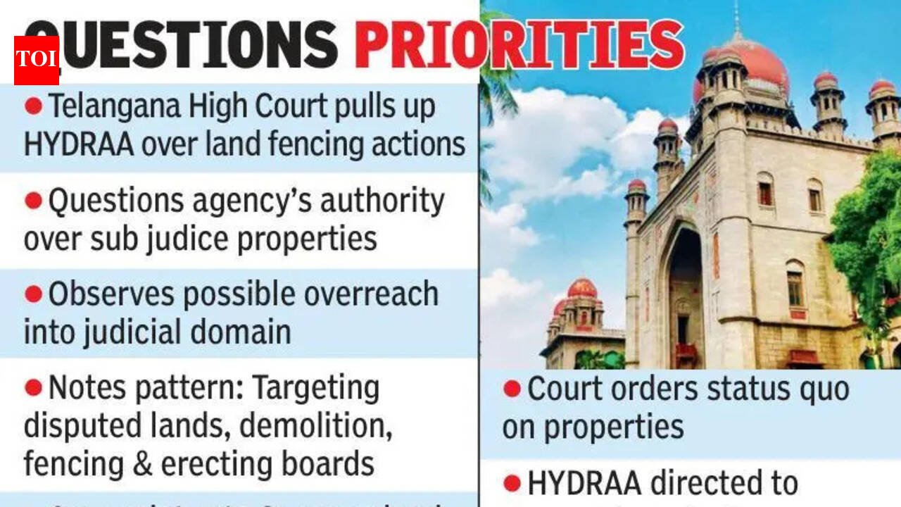 Hyderabad: Taking a stern view of Hyderabad Disaster Response and Asset Protection Agency’s (HYDRAA’s) moves to fence land parcels under the guise of removing encroachments, Telangana high court has asked if the agency was “thinking itself (to be) above the courts” or “running a parallel govt” by unilaterally taking possession of land parcels that are sub judice.Further reprimanding the agency, Justice NV Shravan Kumar noted that the agency’s actions were overlapping judicial authority and pointed out that it is not for HYDRAA to decide where to intervene and take possession of any disputed property.The judge further questioned if HYDRAA had any “vested interest” in targeting disputed land parcels, noting a pattern in the agency’s conduct of selecting properties under litigation, demolishing structures, fencing them, and erecting boards declaring them as govt land.The judge made these remarks while hearing petitions challenging the agency’s action of taking possession of land parcels at Suraram in the city, fencing them, and erecting boards on the property without putting the owners on notice.The judge, while ordering a status quo on the land parcels, further directed HYDRAA to immediately remove the boards erected at the site while allowing the fence to remain. The judge also directed that the Medchal–Malkajgiri district collector be made a party to the petitions and posted the matter to June 10 for further hearing.During the hearing, Justice Shravan Kumar, referring to the properties being sub judice, asked the agency, “Who authorised you to take possession of such land? Was it the revenue department or the MAUD department?”The judge also directed HYDRAA to place on record any permission or communication empowering such actions, while making it clear that unilateral intervention in disputed properties, especially those sub judice, cannot be justified.The judge questioned the agency’s priorities, remarking that the govt body to be focusing disproportionately on disputed land instead of its core mandate of protecting water bodies and managing disaster response. “Why is there no similar urgency in safeguarding lakes and water bodies?” the judge asked.“If you really want to protect such land parcels, file applications before the court and ask for protection. But how could you go to the land parcels, which are sub judice, and how will you decide the title of the land and take possession of it by throwing all residents out?” the judge remarked.
