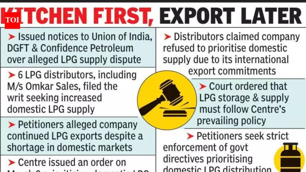 Nagpur: The Nagpur bench of Bombay High Court on Thursday sought responses from the Centre, the Directorate General of Foreign Trade (DGFT), and Confidence Petroleum India Ltd on a petition alleging domestic LPG supply was being neglected, despite govt directions prioritising household consumption over exports.A division bench comprising Justices Anil Kilor and Raj Wakode issued notices to the respondents, while hearing a plea filed by 6 LPG distributors, who contended that continued LPG export during a crisis runs contrary to the Natural Gas (Supply Regulation) Order, 2026, mandating prioritisation of household supply.While adjourning the hearing till March 17, the bench directed the respondents to file their replies before the next hearing on March 17. Counsel Mugdha Chandurkar, appearing along with deputy solicitor general Kartik Shukul, accepted the notice on behalf of the Union govt and DGFT.Observing that the matter raised public concerns, the court recorded “the issue is of a serious nature and of grave importance” and asked the Central authorities to place their response before the next hearing.In an interim direction, the court instructed respondents, particularly Confidence Petroleum, to ensure that “storage and supply of LPG for domestic consumption shall be in accordance with the prevailing policy” of the Union govt.The petitioners, through counsel Shyam and Sahil Dwani, approached the court after alleging that their repeated requests to the company to increase domestic supply went unanswered, despite official orders prioritising household LPG distribution.According to the plea, the Union govt issued an order (March 9) imposing restrictions on export of essential commodities and directing that LPG supply be prioritised for domestic markets amid a tightening supply situation.The distributors claimed the order was issued to control a growing shortage of LPG and other essential commodities in the market, especially as demand surged in recent weeks. However, the petitioners alleged Confidence Petroleum informed them it could not prioritise domestic supply because it had obligations under its international export strategy.The distributors asked the court to ensure strict implementation of the govt’s policy and to direct the company to prioritise LPG supply to domestic markets until conditions stabilise.Key takeaways from HC verdict:Issued notices to Union of India, DGFT & Confidence Petroleum over alleged LPG supply dispute6 LPG distributors, including M/s Omkar Sales, filed the writ seeking increased domestic LPG supplyPetitioners alleged company continued LPG exports despite a shortage in domestic marketsCentre issued an order on March 9 prioritising domestic LPG supply and restricting export of essential commoditiesDistributors claimed company refused to prioritise domestic supply due to its international export commitments.Court ordered that LPG storage & supply must follow Centre’s prevailing policyPetitioners seek strict enforcement of govt directives prioritising domestic LPG distribution.The matter is scheduled for further hearing on March 17, 2026.