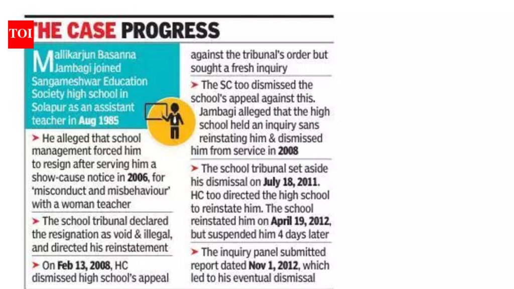 Pune: The Bombay high court’s Kolhapur bench has quashed and set aside Solapur School Tribunal’s order of Nov 25, 2013, that rejected a teacher’s appeal against his dismissal from service on Nov 2, 2012, by a high school in Solapur for ‘misconduct and misbehaviour’ with a woman teacher. The bench of Justice Vrushali V Joshi cited multiple flaws in the inquiry proceedings and violation of rules while directing that the teacher, now retired, was “entitled to continuity of service and to receive back wages, along with all pensionary and other retiral benefits, as admissible under law, treating the service of the petitioner as continuous for all purposes.” On a request by the advocate representing the high school, the bench directed a stay on its order for four weeks to enable the educational institution to approach the Supreme Court against the HC’s latest order. “In the latest round, the inquiry committee did not make any order or recommendation of specific action to be taken. As such, there was non-compliance with the Maharashtra Employees of Private Schools (Conditions of Service) (MEPS) Rules, 1981,” advocate Abhijeet A Desai, who represented petitioner Mallikarjun Basanna Jambagi, told TOI. Jambagi joined Sangameshwar Education Society high school in Solapur as an assistant teacher in Aug 1985. His case is that the high school management forced him to resign and accepted his resignation after serving him a show-cause notice on April 1, 2006, for ‘misconduct and misbehaviour’ with a woman teacher. The school tribunal declared the acceptance of his resignation as void and illegal and directed his reinstatement. On Feb 13, 2008, the HC dismissed the high school’s appeal against the tribunal’s order but asked the management to conduct a fresh inquiry. The SC too dismissed the school’s appeal against this. Jambagi alleged that the high school then conducted a purported inquiry without reinstating him and dismissed him from service on March 30, 2008. Once again, the school tribunal set aside his dismissal on July 18, 2011, citing that an inquiry committee was not constituted as per the MEPS Act and Rules. The HC too directed the high school to reinstate him and proceed in accordance with law. The high school reinstated Jambagi on April 19, 2012, but suspended him four days later and initiated an inquiry with undue haste and violation of MEPS Rules. Jambagi contended that affidavits from the previous inquiries were mechanically relied upon without affording any opportunity for examination-in-chief. He was denied the right of cross-examination, and the inquiry committee submitted its report dated Nov 1, 2012, which led to his eventual dismissal. Justice Joshi observed that the inquiry proceedings were conducted in a manner that was “neither fair nor transparent” as no proper notice, effective hearing, or reasoned and speaking order was passed. “The very object and purpose of the MEPS Rules, which is intended to provide procedural safeguards and ensure fairness in disciplinary proceedings, stands defeated,” the bench said. “The failure to comply with the mandatory provisions of Rule 37(6), Rule 37(2)(d), and other relevant Rules, has vitiated the entire inquiry, rendering it non est in the eyes of law,” the bench said. The high school management sought to justify Jambagi’s dismissal on the grounds that he had been convicted in a parallel criminal proceeding before a magisterial court with regards to the misbehaviour incident. The petitioner, however, said his appeal against this conviction was pending final decision before the sessions court. Justice Joshi cited SC rulings and said “The criminal proceedings before the sessions court and the departmental inquiry are distinct, independent proceedings, governed by different procedures, standards of proof, and statutory requirements. The subsequent conviction in the criminal case can neither retrospectively validate the termination order passed earlier, nor can it absolve the management from complying with the mandatory procedural safeguards enshrined in the MEPS Rules, particularly Rule 37(6).“