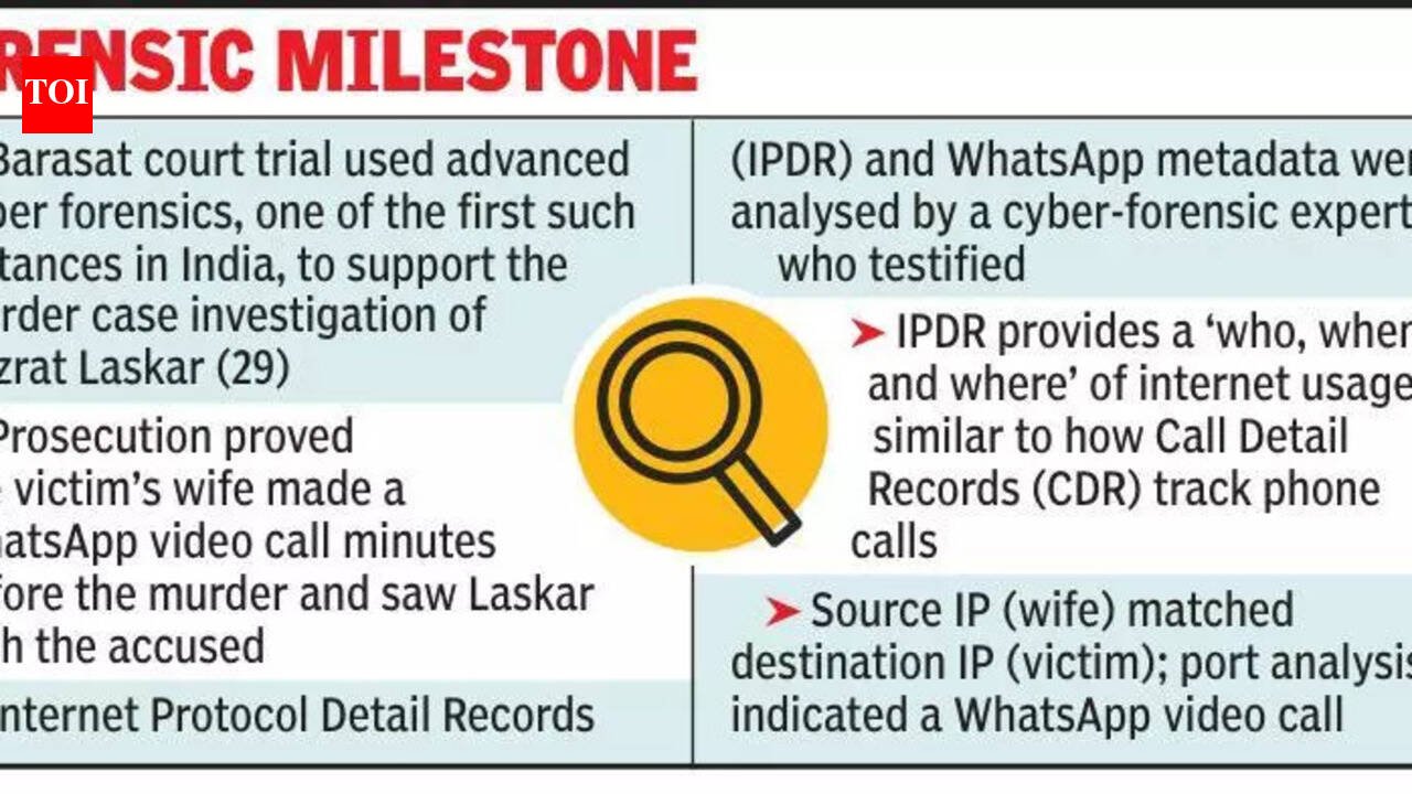 Kolkata: The trial of murdered criminal-cum-police informer Hazrat Laskar (29) at a Barasat Court last week saw the prosecution turn to advanced forensic technology — one of the first such instances in India — to establish technically that the victim’s wife indeed made a video call to Laskar minutes before the murder, when she found the victim accompanied by the accused.The state prosecution, led by special public prosecutor Bivas Chatterjee, said they wanted to use additional evidence in the murder case in which the body was recovered on Jan 31 last year. “His wife saw the two assailants during the video call. But we wanted to go beyond oral evidence. Hence, we studied the Internet Protocol Detail Records (IPDR) of both the victim and his wife, and WhatsApp details, and a cyber-forensic expert’s analysis testified in court in this regard last Friday. IPDR provides a ‘who, when, and where’ of internet usage, similar to how Call Detail Records (CDR) track phone calls. In other words, the source IP of the victim’s wife and the destination IP of the victim matched. Port analysis also confirmed it was a WhatsApp video call,” said Chatterjee.