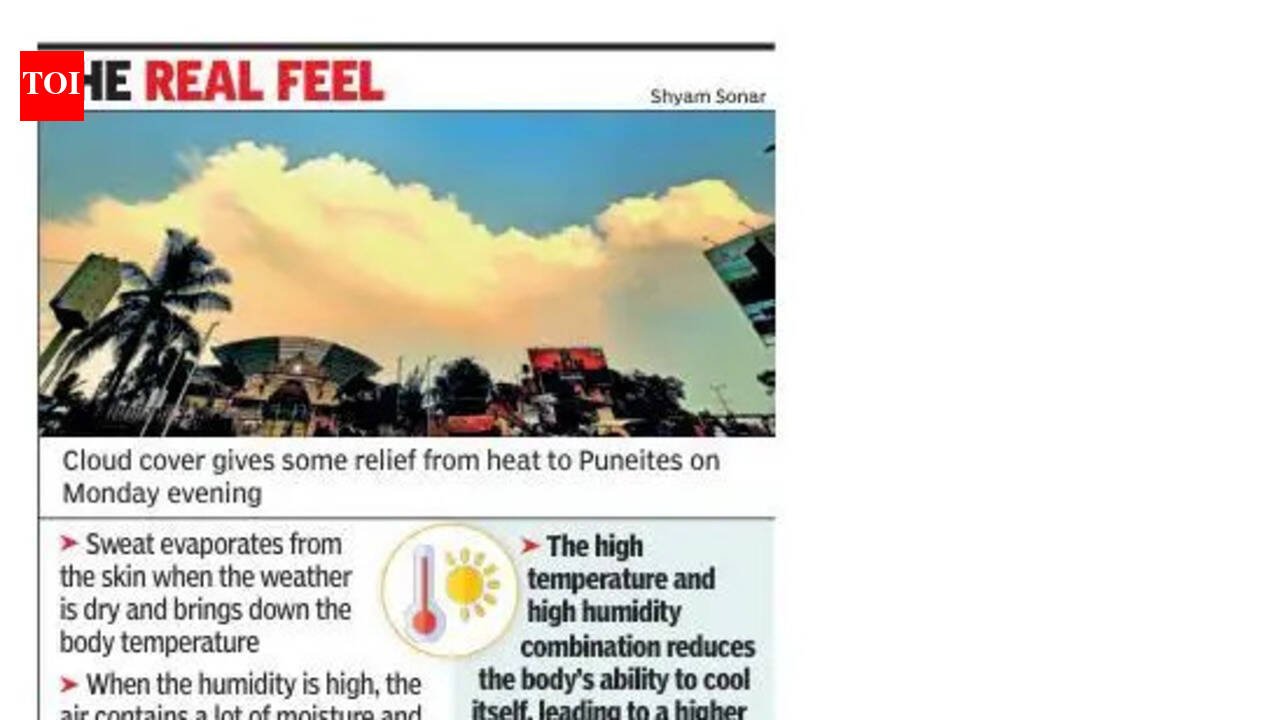Pune: A sharp rise in humidity over the past few days increased people’s discomfort amid maximum temperatures close to 39–40°C in the city, but IMD hinted at some relief in the form of light rain and thunderstorms in the coming days.Data from India Meteorological Department (IMD)’s observatories on Monday showed the maximum temperature was 40.8°C in Lohegaon and 39.7°C in Shivajinagar. Chinchwad and NDA recorded a high of 38.6°C and 37.8°C, respectively. Rainfall remained negligible across stations.The relative humidity has increased significantly in the city over the past three-four days, resulting in a higher “real feel” temperature and sticky conditions. The relative humidity was between 48% and 63% in the past couple of days compared to 21–34% last week.IMD scientist S D Sanap said the spike in humidity was due to moisture incursion over the region. “When both temperature and humidity are high, sweat does not evaporate efficiently. This reduces the body’s ability to cool itself, leading to greater discomfort,” he said.He said such humid conditions were likely to persist for the next three to four days, with rainfall expected across parts of Madhya Maharashtra and Marathwada, including Pune district. “We are expecting light rain and thunderstorms in the coming days. Some parts of the district may have already received very light rain, though it has not been widespread,” he said.According to the IMD’s district forecast, Pune is likely to witness thunderstorms accompanied by lightning, light to moderate rain and gusty winds (30–40 kmph) at isolated places till April 24. Similar activities have been forecast across neighbouring districts, including parts of Nashik ghats and Ahilyanagar. Coastal districts such as Thane and Palghar may get light rain or thundershowers.The high humidity of late is leaving residents exhausted. “Even short walks leave you drenched in sweat,” said Shweta Tiwari, a Shivajinagar resident.Piyush Mane from Kothrud said, “Fans are not enough anymore. The humidity makes it feel much hotter than what the temperature shows. It is suffocating indoors and outdoors both.”IMD scientist Sanap said, “When the weather is dry, the body cools itself efficiently through sweating. The sweat evaporates from the skin, and this evaporation helps bring down the body temperature. But when the humidity is high, the air contains a lot of moisture. So, the sweat does not evaporate easily.”In such conditions, the body continues to sweat, but the evaporation rate is much lower. As a result, the cooling mechanism becomes less effective. Sweat tends to remain on the skin instead of evaporating, and the body struggles to lose heat.Sanap said, “This is why people feel more uncomfortable during humid conditions. The combination of high temperature and high humidity reduces the body’s ability to cool itself, leading to a higher ‘real feel’ temperature and persistent stickiness.”