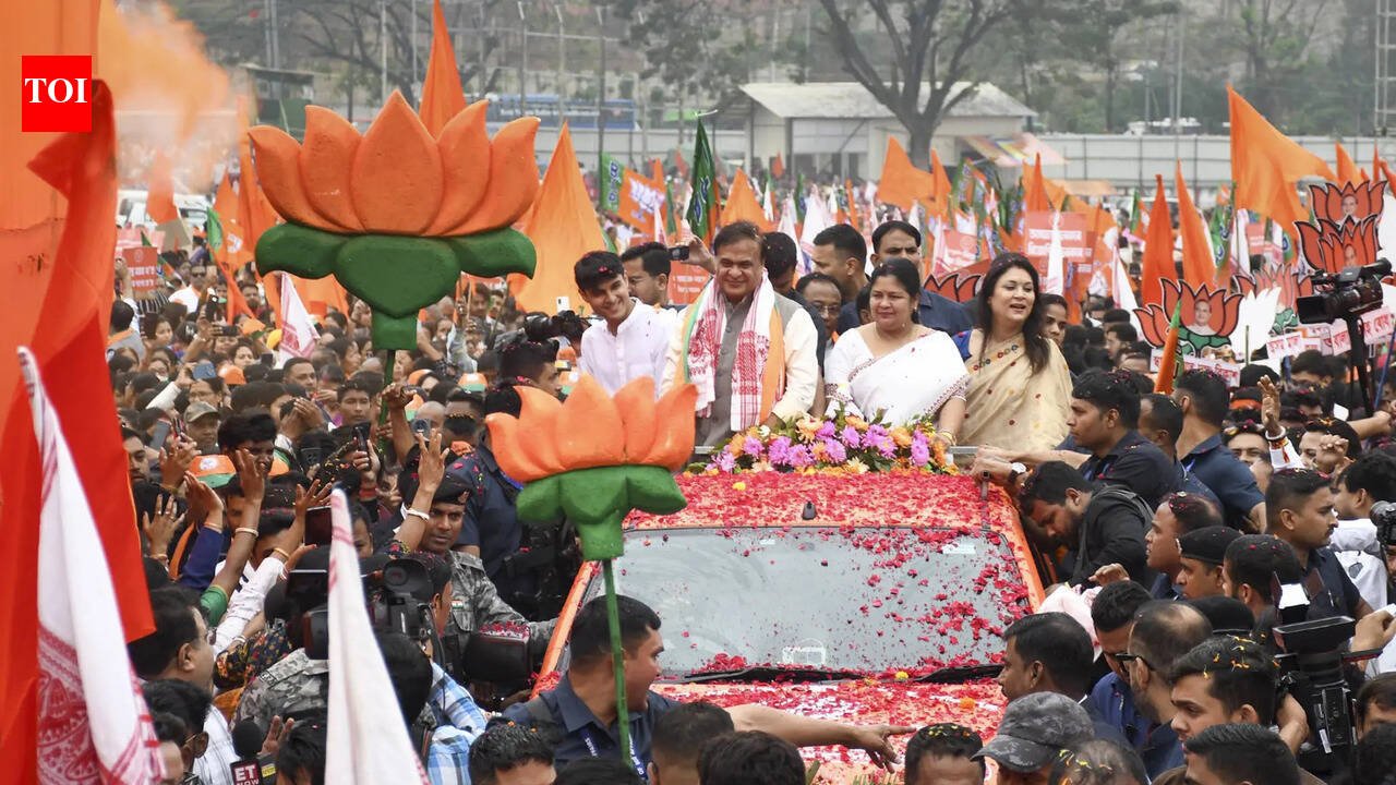 Guwahati: Accompanied by his wife Riniki Bhuyan Sarma and son Nandil Biswa Sarma, in an open-top car, CM Himanta Biswa Sarma on Friday filed his nomination papers at the Hengrabari election office, seeking a sixth consecutive term from his home constituency — Jalukbari.Demonstrating his political might, Sarma, covering a distance of 5.6 km from the Veterinary Field in Khanapara to the election office, led a massive show of strength as thousands of supporters, majority of whom were women, braved incessant rains to accompany him.With cut-outs, banners and air-rending slogans, Sarma’s nomination-filing procession echoed with the beats of the traditional Assamese and Punjabi dhols, before the CM was greeted by the traditional ‘gayan-bayan’ (a group of traditional devotional performers), Bihu dancers and drummers along the route.Besides his wife and son, with whom he was seen clicking a selfie, Sarma was also accompanied by BJP’s Gauhati Lok Sabha MP Bijuli Kalita Medhi and mayor Mrigen Sarania.Dividing his journey into two halves, Sarma got off the vehicle at Last Gate in Dispur, walked for a few minutes before taking another vehicle to reach the office of the district commissioner-cum-district electoral officer.Prior to filing his nomination, the CM said he had sought blessings from his mother Mrinalini Devi. “Auspicious occasions should always begin with mother’s blessings. Though I don’t get to spend much time with her these days, her blessings always power me to continue serving Aai Asomi (mother Assam),” Sarma posted on X.Urging people to bless him and all the other candidates belonging to BJP and its twin allies — Asom Gana Parishad (AGP) and Bodoland Peoples’ Front (BPF) — Sarma expressed gratitude towards his supporters for turning up despite heavy showers.“It will not be possible for me to campaign extensively in my own constituency, as I have to campaign in other seats. The party workers will take care of my campaign. I will also try to go and Riniki (his wife) will also visit some places,” Sarma said, adding that he will address at least five to six meetings in a day.Shedding light on campaigning by national leaders, including PM Narendra Modi, Sarma said the PM was expected to address three meetings, while Union home minister Amit Shah will address six to eight meetings.Describing the occasion as a, “very happy moment”, Riniki said, “The people of Jalukbari consider Himanta as the head of the family, and this huge gathering shows their support and blessings for him .”“He belongs to the public and for the last 25 years has been serving them, which he will continue to do so in the future. I have been helping him in his campaign for the last several elections and will continue to do the same this time as well,” she added.