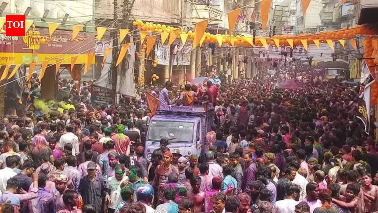 Kanpur: The week-long Holi celebrations concluded in the city on Tuesday evening with the traditional Ganga Mela at Sarsaiya Ghat on the banks of the Ganga.Thousands of residents participated in the historic ‘Rango Ka Thela’ procession in the morning and later gathered at Sarsaiya Ghat in the evening to exchange Holi greetings.The celebrations commenced after district magistrate Jitendra Pratap Singh and Police Commissioner Raghubir Lal hoisted the national flag at Rajjan Babu Park and paid floral tributes to freedom fighters before flagging off the colourful procession on Tuesday morning. Thousands of people gathered along Birhana road to welcome the procession.People showered flower petals on the procession and showered coloured water. The participants were offered gujhia, snacks, and water as the procession passed through the city areas. However, special attraction of the procession—the traditional buffalo cart—was missing this year due to its unavailability. A member of the Hatia Ganga Mela committee, Gyendra Bishnoi, said the organisers were ready to bear any cost for arranging the cart but could not find one. In its absence, the procession comprised six camels, five horses, eight tractors with trolleys, and several four-wheeler loaders.Participants danced to the beats of music and applied colours on each other. A matki-breaking ceremony was also organised on Birhana Road. Revellers covered their faces with masks or helmets, while a groups of youths enjoyed ‘Kapda-Fad Holi,’ tearing their shirts and throwing them towards overhead power lines. Muslims welcomed the procession by showering flower petals and greeting participants, reflecting the spirit of communal harmony.Cultural programmes representing different communities were presented along the road leading to the ghat. Various organisations and associations set up stalls from Chetna Crossing to the ghat. Folk artists performed traditional songs and dances, and recited Kajari and Alha.The procession passed through its traditional route via General Ganj, Mani Ram Bagia, Meston Road, Chowk, Kotwali Crossing, Kamla Tower, Pheelkhana, Birhana Road, and Nayaganj before reaching Rajjan Babu Park around 2 pm.The celebrations at the ghat began around 4pm with the arrival of district administration officials, public representatives, and citizens. The fair was inaugurated by the DM in the presence of mayor Pramila Pandey, MP Ramesh Awasthi, and other officials.At the ghat, members of the Sikh community distributed sharbat to visitors. Devotees also visited the riverbank and offered prayers to the Ganga for prosperity, good health, and communal harmony before returning home, bringing the city’s week-long Holi festivities to a close.