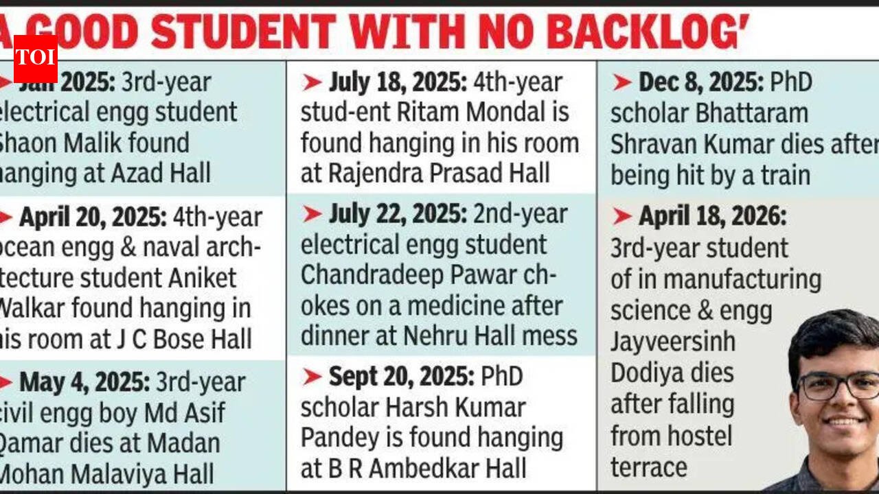 Kolkata/Kharagpur: A third-year IIT Kharagpur student died after reportedly falling from the eighth-floor terrace of Atal Bihari Vajpayee Hall of Residence on Saturday. Preliminary findings hinted at suicide, police said. Jayveersinh Dodiya (21) is the eighth Kharagpur campus student to die in the past 15 months.The Nehru Hall of Residence boarder from Ahmedabad was a student of a five-year dual-degree (BTech and MTech) course in manufacturing science and engineering in the mechanical engineering department. The death coincided with end-semester exams that, too, started on Saturday. Dodiya had an exam slated for Sunday and he reportedly studied with his friends till early on Saturday. Police said around 9.15 am, some staff members heard a loud thud and rushed outside to find a bleeding Dodiya lying unconscious with severe injuries in front of the Atal Bihari Vajpayee hostel. They alerted the security, police and the medical team. “Dodiya was taken to the Emergency at BC Roy Technology Hospital, where, upon examination, he was declared deceased. Dodiya’s family has been informed,” read the institute’s press statement.Police said, “Preliminary findings suggest Dodiya died by suicide but formal statements will be issued only after an autopsy is completed at Midnapore Medical College Hospital on Sunday and his family arrives. We will examine the CCTV footage to see when he left the Nehru Hall of Residence. CCTV footage shows he entered Atal Bihari Vajpayee Hall between 8.45 am and 9 am but we are checking how he accessed the terrace. We will check his call records,” said a district police officer, adding they had seized Dodiya’s glasses and clothes. A campus insider said the hostel terraces were kept shut but the one at Atal Bihari Vajpayee Hall might have been opened for some work.An atmosphere of sorrow hung over the Kharagpur campus with students and faculty members struggling to come to terms with the sudden loss. Dodiya had a good academic record and was involved in the Business Club at the institute. “Dodiya was a student of manufacturing science and engineering with specialisation in industrial and systems engineering. He had no backlog, his overall CGPA was around 7.7 and in the last semester, his CGPA rose to around 8. As he was a dual-degree student, he did not face any stress over internship and placement,” said a campus insider. “Academic load has anyway been reduced by keeping 30-mark papers for two hours.”Dean of student well-being Arun Chakraborty said at a time, when the institute was making efforts to ensure students’ welfare, the incident shattered them. “There is no record of the student visiting the counselling centre or taking help from mental health experts on the campus. He did not have any exam on Saturday, he was to appear for a test on Sunday. His friends said he studied with them till late at night and that they had no clue when he left the hostel,” Chakraborty said.Among the measures taken to help students are the AI-driven mental wellness initiative SETU, creating the post of dean of student well-being, restructuring the counselling centre, forming a students’ task force at hostels, holding stress management workshops, recruiting mental health experts as wellness buddies at hostels at night and introducing life skills and joy and success courses.