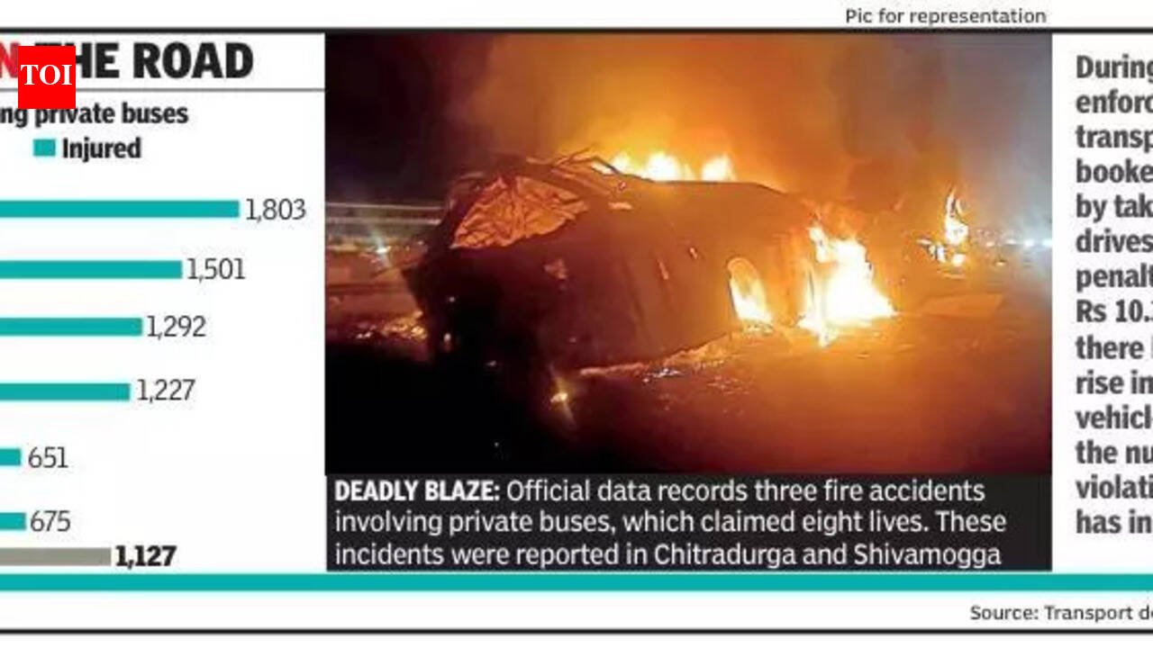 Bengaluru: Road accidents involving private buses have claimed 1,127 lives in the state over the past six years, with official data revealing a sharp rise in recent years and raising serious concerns about safety compliance. According to the transport department, 3,823 accidents were reported during this period, largely attributed to driver negligence, technical faults, and violations of road safety norms.The situation has worsened significantly, with the number of accidents more than doubling from 335 in 2020 to 847 in 2025. Fatalities increased from 114 to 253 over the same period, while the number of injured surged from 675 to 1,803. The data also records three fire accidents involving private buses, which claimed eight lives and left six injured. These incidents were reported in Chitradurga and Shivamogga. The surge in accidents and casualties has put the spotlight on enforcement gaps, vehicle fitness, and operational practices in the private bus sector.During the period, the enforcement wing of the transport department booked 46,650 cases by conducting 68 special drives and collecting penalties exceeding Rs 10.3 crore. Despite no significant increase in the number of vehicles inspected, the number of violations detected has risen sharply. Responding to questions raised by MLC D Arun on action taken against errant private operators, transport minister Ramalinga Reddy said that in 2020-21, regional transport offices (RTOs) inspected 23,086 vehicles and booked 3,922 cases. In contrast, in the current financial year so far, 20,289 vehicles have been inspected, but as many as 11,165 cases registered — more than double the violations recorded six years ago.March 31 deadlineFollowing a series of fire incidents involving sleeper coach buses, the state govt has set March 31 as the deadline for private operators to comply with enhanced safety norms. Officials said strict directions have been issued to private bus operators and bus body builders to adhere to prescribed standards aimed at improving passenger safety.As part of the revised guidelines, partition doors behind the driver’s cabin must be removed, as they can obstruct evacuation through the front exit during emergencies. The use of berth sliders in air-conditioned sleeper buses has also been prohibited, with officials citing safety risks associated with manual sliding mechanisms used in place of curtains.The department has mandated a minimum of four emergency exits in 12-metre buses and at least five in buses exceeding 12 metres in length. Installation of fire extinguishers has been made compulsory across all such vehicles. Transporting commercial goods in passenger buses has also been strictly prohibited.Officials said the measures are in line with directions from the National Human Rights Commission, which called on states to implement recommendations from a safety study conducted by the Central Institute of Road Transport. Fitness certificates (FCs) will not be issued to buses that fail to comply with the new safety requirements.