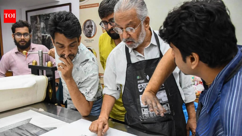 New Delhi: Outside, the weekend afternoon drifts by in a familiar haze. The traffic has thinned, the sun hangs heavy, and the city seems to have agreed, briefly, to slow down. Inside a room at the National Gallery of Modern Art (NGMA), nothing does.The moment the door opens, movement replaces the lull. Hands are already at work — wiping, scratching, dipping, pressing — never pausing long enough to rest. The air is thick with the smell of ink and metal, with something faintly burnt. Tables are crowded with long white sheets that resemble neither finished artworks nor blank surfaces, but something suspended in between.At one end of the room, artist Rm. Palaniappan leans over a zinc plate darkened to a dull black. He is not drawing on it. He is drawing into it. A fine needle cuts through the surface with a soft, stubborn sound. The line does not appear in ink; it is carved out of resistance. “You start somewhere and you end somewhere,” he says, eyes fixed on the plate. “The journey is the work.”A few feet away, another artist lowers his plate into a shallow bath. The liquid looks harmless. It is not. Nitric acid begins its quiet work, biting into the exposed lines. There is no splash, no spectacle — just time and patience. “This is etching,” Palaniappan says, almost as a reminder.Nearby, someone works ink into barely visible grooves, palms stained, cloth moving in slow circles. At the press, Hanuman Kambli places the inked plate on the bed, lays a sheet of damp paper over it, then covers it with felt. The wheel turns. The machine resists for a moment, then yields with a low, heavy sound.When the paper is lifted, the room leans in.An image has appeared — not drawn, not painted, but pressed out of metal.This is the rhythm inside NGMA’s newly launched printmaking studio, its first-ever dedicated space for the medium, opened under the leadership of director general Dr Sanjeev Kishor Goutam. In the days ahead, this rhythm is expected to deepen as the studio slowly finds its own pace.Kambli studies the print for a moment. Something is off. He does not explain. Instead, he reaches for another tool and begins polishing the plate again. “There are many needles, many tools,” he says. “I’ve spent my life doing this.”The print goes back into the process. Nothing here is final.Across the room, conversations drift in and out. Artists compare notes. Someone mentions how a single work can take days. Artist NG Bagodi Vijay speaks about adding layers, sometimes even burning resin to build texture. Each print carries time inside it.“Printmaking is not merely a technique. It is a philosophy of multiplicity, accessibility and experimentation,” Goutam says. The studio — with its custom-built press modelled on a rare machine from Visva-Bharati University — is as much about revival as it is about reinvention.“This is just the start. We plan to launch a three-month programme for art enthusiasts and explore future collaborations with Indian and international artists,” says Goutam.The inaugural workshop, ‘Chhapankan’, which concluded on Saturday, saw artists coming together from across the country, each carrying their own language of lines, textures and time.As Ananda Moy Banerji puts it, “From a polished zinc plate to a finished print, the process is a quiet dialogue between artist and material, where lines are drawn through resistance, bitten by acid into permanence, filled with ink, and finally pressed into paper.”Meanwhile, back in the room, the wheel turns again. Another sheet is lifted. Another image emerges.