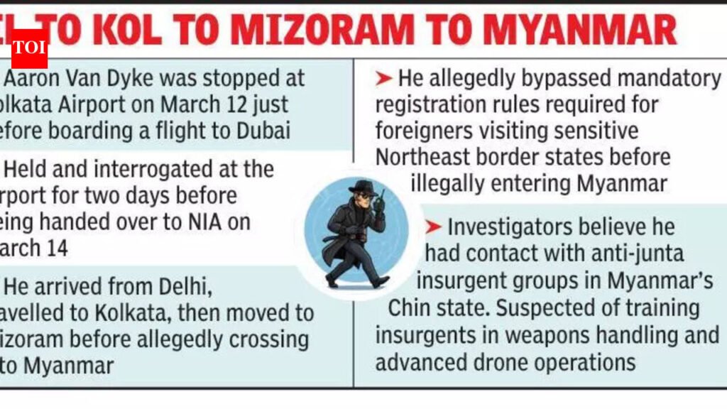 Kolkata: Fresh details emerging from the probe into the arrest of US national Aaron Van Dyke have revealed that he was detained at Kolkata airport for nearly two days before being formally handed over to the National Investigation Agency (NIA), as authorities pieced together his suspected cross-border activities and links with insurgent groups.According to inputs shared by Bidhannagar Police and airport immigration officials with the NIA, Van Dyke was intercepted on March 12 moments before boarding a FlyDubai flight FZ 462 to Dubai, in what officials described as a “last-minute intervention” based on intelligence alerts.“His luggage had already been checked in and loaded onto the aircraft. He had cleared immigration and was about to depart when he was stopped,” a senior official said.From Dubai, Van Dyke had planned to take a flight (FZ 1839) to Warsaw, Poland. Instead, he was escorted to an immigration holding facility within Kolkata airport, where he remained under sustained interrogation for two days.During this period, officials examined his travel trail, contacts and suspected movements across conflict zones. “After preliminary interrogation, the NIA took him into custody on March 14 for further investigation,” the official added.Investigators have since reconstructed parts of his movements within India. After arriving from Delhi alongside a group of Ukrainian nationals, Van Dyke travelled to Kolkata and then proceeded to Mizoram. From there, he allegedly crossed the international border into Myanmar without completing mandatory formalities required for foreign nationals visiting sensitive northeastern states.Under existing regulations, foreigners entering border states such as Mizoram, Nagaland and Manipur must register with the local Foreigners Registration Office within 24 hours. Officials said Van Dyke bypassed these requirements.Sources indicated that during his time in Myanmar’s Chin state, Van Dyke is suspected to have trained anti-junta insurgent groups in weapon handling and advanced drone operations. Investigators believe the nature of this training, particularly involving military-grade drone capabilities, poses significant security concerns for India.Security agencies are now assessing the broader implications of these activities. Intelligence inputs suggest that several insurgent outfits operating along the India-Myanmar border maintain links with extremist groups in India’s Northeast. Officials warned that the introduction of advanced drone technology into this ecosystem could sharply escalate the operational capabilities of such groups.On March 13, three Ukrainian war veterans — Petro Hurba, Taras Slyviak and Ivan Sukmanovskyi — were detained by Bureau of Immigration officials at Lucknow airport and subsequently handed over to the NIA. They are believed to have provided key leads about Van Dyke’s activities. Three more Ukrainians — Stefankiv Marian, Honcharuk Maksim and Kaminskyi Viktor — were held in Delhi as part of the probe.NIA has stated that the trio held in Lucknow entered India from the UAE on tourist visas last Dec before travelling to Mizoram without the mandatory restricted-area permits. During their stay, they are suspected to have crossed into Myanmar and established contacts with armed groups considered hostile to India.