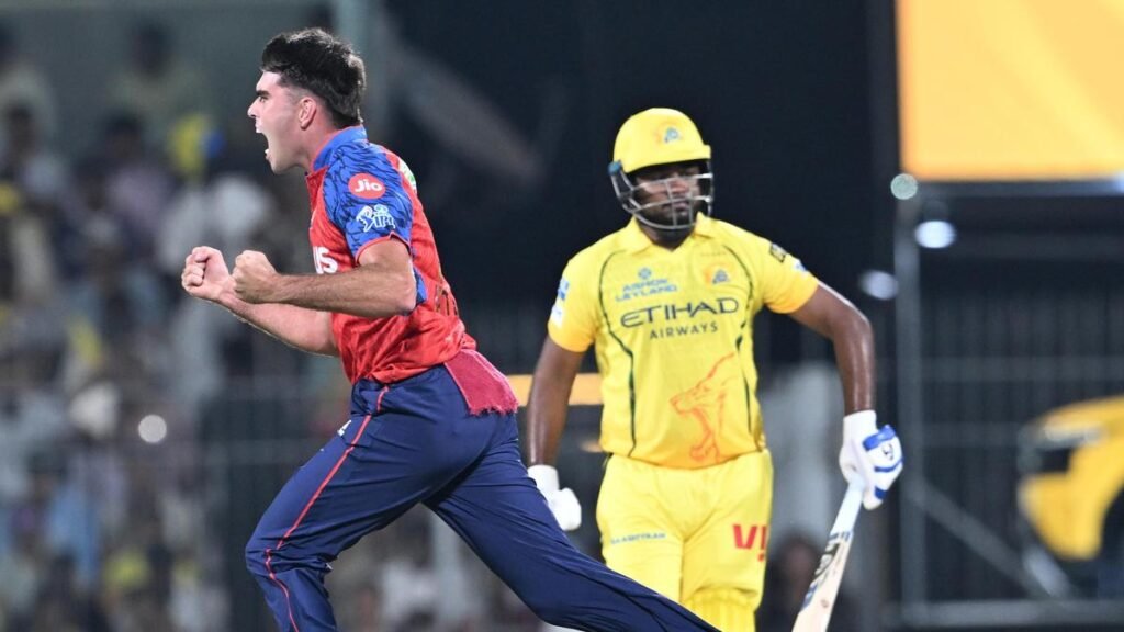Punjab Kings’ Xavier Bartlett and CSK’s Sanju Samson during the IPL match at Chepauk, Chennai, on April 3, 2026.