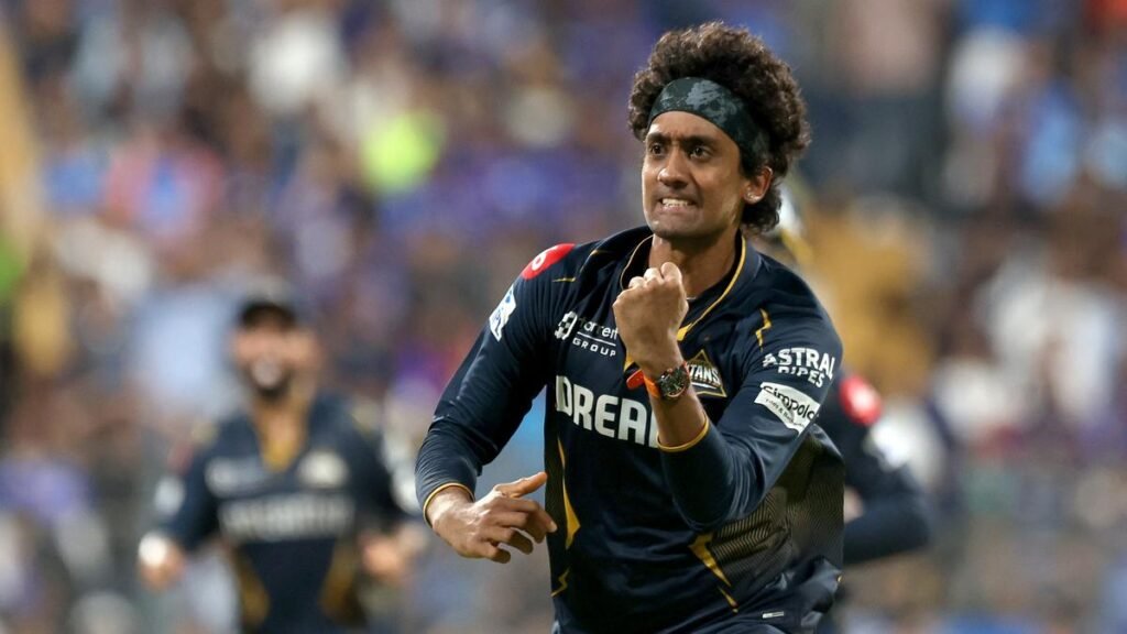 Sai Kishore of Gujarat Titans celebrates after taking a wicket. File