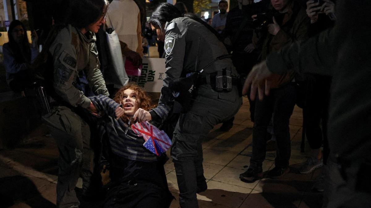 A demonstrator is detained by Israeli security forces during an anti-war protest, calling for an end to the U.S.-Israeli conflict with Iran, at Habima Square, in Tel Aviv, Israel, March 28, 2026.