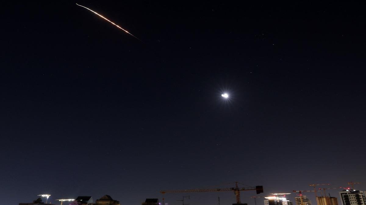 Rocket trails are seen near the moon in the sky above the Israeli center coastal city of Netanya amid a fresh barrage of Iranian missile attacks on March 11, 2026. Iran will target economic and banking interests linked to the U.S. and Israel in the region, Iran military spokesperson said.