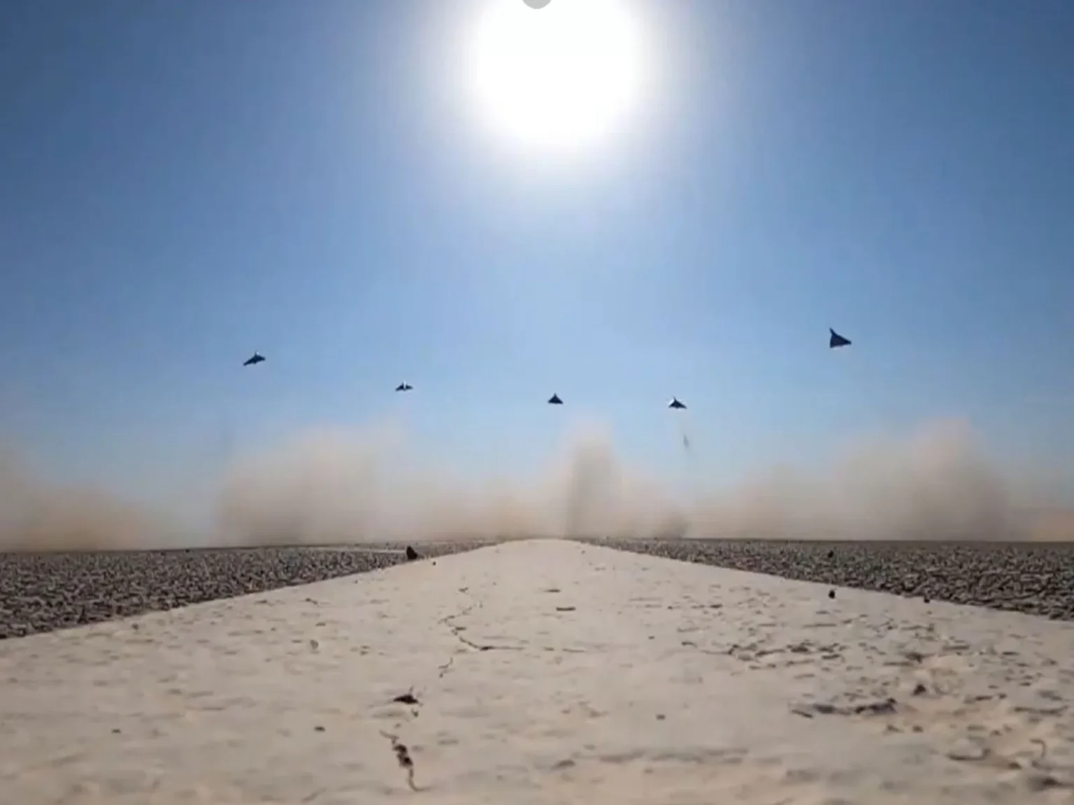The footage transitions to show the aircraft flying in a tight formation across the horizon, moving away from the launch site as part of the reported “swarm” deployment.