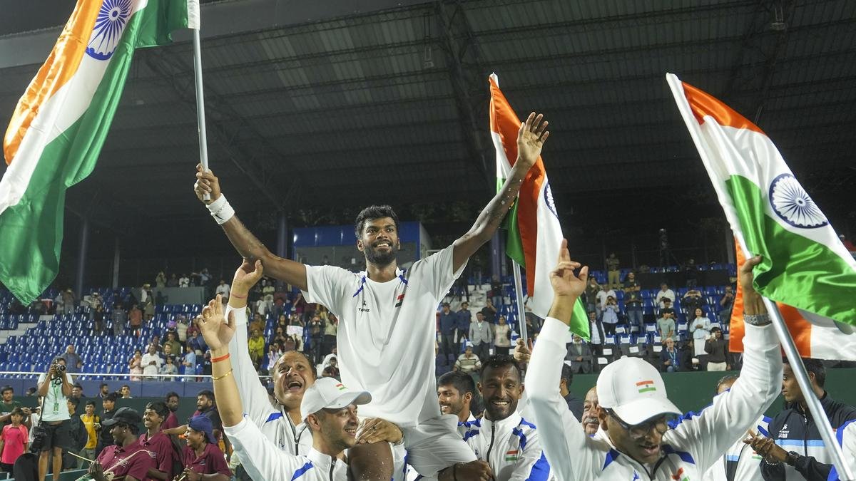 Dhakshineswar Suresh being carried by teammates after India won the Davis Cup Qualifier round one against Netherlands in Bengaluru on February 8, 2026