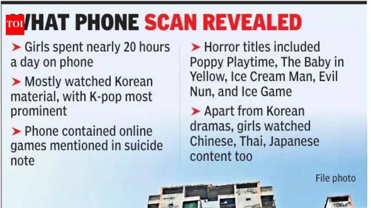 Police said that the phone was sold by their father, Chetan Kumar, to the Shalimar Garden shop for Rs 15,000 about 15 days before the incident. The device had been sent for forensic examination to retrieve deleted data and map the girls’ online activity and contacts.An officer said the phones were central to establishing what the sisters were consuming online and whether they were in touch with anyone outside the family. Data recovered so far shows the sisters were heavily invested in Korean culture, with K-pop featuring most prominently.The cops also found material linked to games named in the suicide note, including the horror titles Poppy Playtime, The Baby in Yellow, Ice Cream Man, Evil Nun and Ice Game. Patil said police had already sent a report to govt seeking a ban on these five games.“A request was sent to govt to ban these five games. As of now, we are trying to recover the other phone that the girls’ father had sold off three months ago. We also need to scan the social media activity of the girls,” the officer said.The recovered phone’s YouTube history also shows an extensive list of Korean and Chinese songs, police said. Apart from Korean drama and films, the girls watched Chinese, Thai and Japanese content. Gaming videos and cartoons also featured prominently, such as Doraemon, Shinchan, PJ Masks, Masha and the Bear, Shimmer and Shine and Peppa Pig.The sisters’ increasing fixation with everything Korean has also drawn attention to their isolation and growing dependence on an online fantasy life. The girls had stopped going to school after Covid and had few, if any, friends, becoming increasingly dependent on each other and on their phones. They had also started a YouTube channel in 2025 focused on K-dramas and cartoon characters, which grew to more than 2,000 followers, but was deleted about 10 days before their alleged suicides.The channel, police said, was removed after their father objected to their escalating obsession with Korean culture.A private tutor, who taught them briefly, also told police and family members that the girls introduced themselves to her with Korean names — Maria, Aliza and Cindy — and claimed they had been adopted from Korea and China.“They were very weak in studies. When I gave them basic calculations, like additions and multiplications, they failed to even recognise numbers. When I asked them about their Korean names, they said they had been adopted from China and Korea. I asked their father about it. He told me about their obsession,” said the tutor, who stopped teaching them after a few sessions.It was around six months ago that Kumar had bought two phones for the eldest daughter and her 14-year-old half-sister, believing they would become “famous like YouTubers”. He sold one of the phones three months ago, and the other one just 15 days before the suicides.
