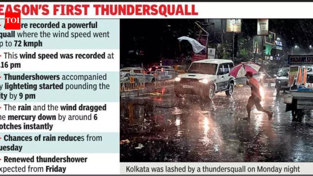 Kolkata: The nor’wester season is on in the city with Kolkata’s first brush with a squall on Monday night. Thunder, lighting, rain accompanied by gusty wind swept across the city, minutes after the Met office issued a red alert for Kolkata, neighbouring Howrah and South 24 Parganas. Alipore weather office recorded a powerful thundersquall with the wind speed reaching 72 kmph at 9.16 pm. A combination of the gusty wind and the rain spell dragged the mercury down by close to six degrees instantly. On Monday, the city recorded a maximum temperature of 32.9°. Within minutes of the onset of thunderstorm activities, the mercury plummeted to around 26°. The Monday night spell, which began around 9 pm, hit all parts of the city evenly. Sources said some pockets in Kolkata encountered some waterlogging during the rain spell that went on for more than an hour.Though Kolkata had a prelude to the nor’wester on Sunday night itself, the city received only light rain the previous night. Despite strong and sustained winds sweeping across the city, Alipore had recorded only 0.1 mm of rain on Sunday.The Met officials said that while chances of thundershower will diminish from Tuesday, there is possibility of renewed rain activities from Friday. “Though chances of thundershowers in the city will be reduced from Tuesday, we can expect renewed rain possibility from Friday,” said meteorologist H R Biswas, head of the Regional Meteorological Centre (RMC) Kolkata.The Met officials said that strong moisture incursion and favourable wind pattern at the lower level had triggered powerful thundercloud formation. At present, Kolkata is getting the south westerly or southerly wind system at the lower level. In addition, there is also a western disturbance passing through the northern region around Nepal, which was also a factor triggering the rain in parts of southern districts and North Bengal. Meteorologists said that while nor’wester spells and squalls are more common during April and May, before the onset of pre-monsoon showers, such spells can happen in March due to certain favourable weather conditions.“By Tuesday, the wind pattern is likely to change to the westerly system when the wind speed will also reduce along with the chance of rain. The mercury could be rising slightly till the next rain spell,” Biswas said.Met officials said that as the wind is reducing the heating, the weather will be bearable despite the slight rise. In addition to Kolkata, Howrah, North and South 24 Parganas and some other southern districts also received thundershowers.