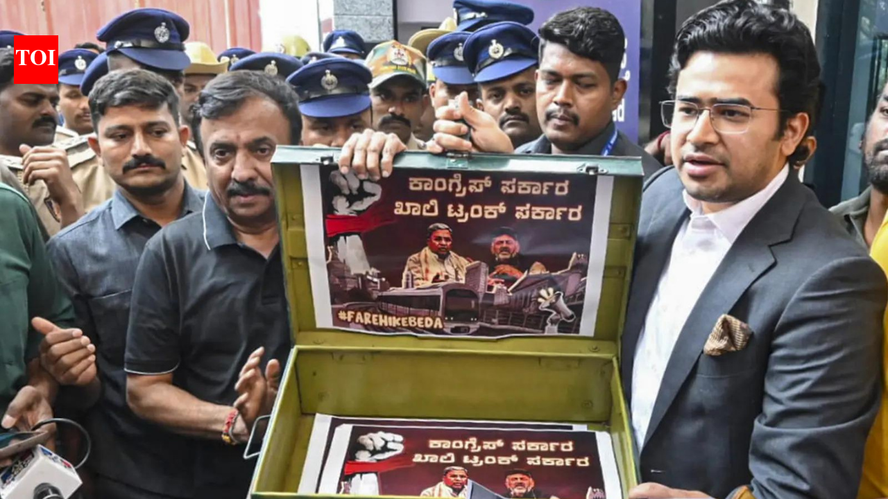 He added that the state govt had provided Rs 1,064 crore to compensate for cash losses and paid Rs 4,002 crore to the Centre towards loan repayment. However, in Davanagere, chief minister Siddaramaiah appeared to contradict Shivakumar, saying the state govt had no role in determining Metro fares and the decision rested with the Metro chairman appointed by the Centre. Surya’s ‘empty trunk’ protest On Monday, Bangalore South MP Tejasvi Surya arrived at RV Road Metro station carrying an empty trunk bearing a sticker that read: “Congress Sarkara, Khali Trunk Sarkara.” It also had on it images of the CM and DCM. Taking a dig at the state govt, Surya alleged that the fare hike followed a communication from state officials to the FFC stating that an increase was necessary to reduce the financial burden on the govt. Accusing the state of splurging public money on guarantee schemes, he claimed that this had led to the withdrawal of “shadow financial support” to BMRCL. This, he alleged, forced the Metro operator to seek a steep fare hike through the FFC to offset losses. Police stopped Surya, Jayanagar MLA CK Ramamurthy, and others from entering the Metro station. They were detained briefly before being released. Surya reiterated that the Namma Metro fare revision was put on hold only after Union housing and urban affairs minister Manohar Lal Khattar intervened. BMRCL board meet cancelled A board meeting of BMRCL, scheduled for Monday, was cancelled following instructions from the ministry of housing and urban affairs (MoHUA). On Sunday, BMRCL announced that the proposed annual fare revision of 5%, scheduled to take effect from Monday, was put on hold until further orders. It also said a decision on revised fares would be communicated after a board review. Sources said the board meeting was indeed scheduled for Monday, but a communication from the Union govt led to its cancellation. “The reason for cancelling the meeting is not known, and it is unclear when the next meeting will be held,” a source said. The BMRCL board is chaired by the secretary of MoHUA and includes representatives from both the Union and state govts.