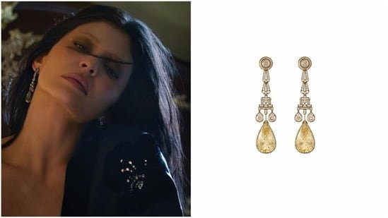 Her styling leans into sultry sophistication – sleek, glossy hair cascading over one shoulder, minimal jewellery apart from the statement earrings, and strappy yellow heels that introduce a sharp pop of colour against the otherwise dark palette. Together, the look merges Hollywood glamour with Indian high jewellery craftsmanship, with the reality TV star’s understated styling ensuring the sculptural earrings remain the focal point of the fashion moment.