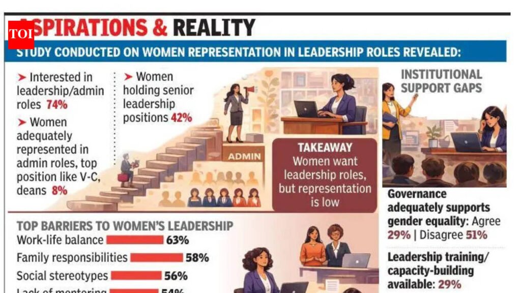 Lucknow: Low representation of women in senior academic and administrative positions in higher education institutions across Lucknow division is not due to lack of interest, merit or capability, but because of weak institutional frameworks, non-gender-responsive policies and limited support systems, a study has found.The findings are part of study titled “Challenges to Women’s Leadership in Higher Education: A Policy-Oriented Study in Central, State, Private Universities, and Affiliated Colleges of Lucknow Division conducted by RMLNLU associate professor Shashank Shekhar with the support of the Association of Indian Universities, New Delhi. It highlighted that work-life balance, family responsibilities, social stereotypes, lack of mentoring and training, limited institutional support, networking opportunities as compared to male counterparts, and gender bias as some of the major hurdles. “The research is based on responses from 100 participants drawn from central, state and private universities, govt and private colleges, deemed institutions and other higher educational institutions in the region. Of the total respondents (including male and female), only 8% believed that women are adequately represented in administrative roles,” said Shashank Shekhar. He said lack of aspiration was not an issue. About 74% of respondents said they were interested in pursuing leadership or administrative roles but cited weaknesses of the institutional routes. The study shows that actual representation remains weak. While 42% of respondents said women hold senior leadership positions in their institutions, only 8% believed that women are very adequately represented, which means they got top positions like vice chancellor, directors and others. A large number of respondents felt that women’s representation is either very limited or nearly absent. “Only 8% said women got key positions, 26% were moderately represented, like given roles of department head or appointed as assistant in a board, 41% were slightly represented, which means they were just a part of an administrative body, while 25% were not represented at all,” said Shashank. The study also raises concern about the governance environment within institutions. Only 29% of respondents felt that institutional governance adequately supports gender equality while 51% disagreed. In addition, only 29% reported the availability of leadership training or capacity-building programmes, and only 24% said mentoring programmes existed in their institutions. This points to a serious weakness in the systems, he said. Around 72% of respondents said flexible work policies can strengthen women’s leadership in higher education. Support needed from the institution is of time flexibility, care responsibility support and better administrative engagement pathways. The study recommended transparent selection procedures, mentoring and sponsorship systems, leadership development programmes, gender audit, better representation in committees and adoption of workplace policies sensitive to care responsibilities.