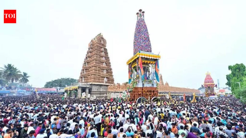 Mysuru: Lakhs of devotees gathered to witness the grand Gautama Pancha Maharathotsava, which was a part of the annual ‘Dodda Jathre’ at the Srikanteshwara temple in Nanjangud, on Monday.Rituals commenced at midnight under the guidance of chief priest J Nagachandra Dikshit. During the auspicious timing of Meena Lagna between 5.50 am and 6.30 am, the idol of Lord Srikanteshwara was ceremoniously installed on the Srimanmahu Gautama chariot.Nanjangud MLA Darshan Dhruvanarayana formally initiated the chariot procession by performing puja and breaking coconuts near the wheels. Devotees, who were eagerly waiting for the moment, enthusiastically pulled the chariot while groups of youths danced to the rhythmic beats of traditional drums, creating a vibrant atmosphere.Thousands of devotees lined on both sides of the chariot street and gathered atop buildings to catch a glimpse of the beautifully decorated Gautama chariot carrying the idol of Lord Srikanteshwara. The chariot, adorned with colourful fabrics and elaborate floral decorations spelling ‘Nanjundeshwara Rathotsava,’ drew widespread admiration. The procession followed a traditional sequence, beginning with the Ganapathi chariot, followed by Gautama chariot carrying Lord Srikanteshwara, then the Subrahmanyeshwara and Chandikeshwara chariots, and finally the chariot of Goddess Parvati.The Gautama chariot completed its circuit and returned to its original position within an hour and a half, followed by the Parvati chariot. The entire five-chariot procession captivated devotees for nearly four hours. The Pancha Maha Rathotsava was the main highlight of the festival, featuring a majestic chariot standing nearly 90 feet tall and weighing around 205 tons. The massive chariot was beautifully decorated with vibrant fabrics and fresh flowers for the grand procession.Darshan Dhruvanarayan said, “The preparation for this big event started two months ago. Every year, the number of devotees is increasing. Keeping this in mind, we ensure to take more precautions to handle the crowd.”Authorities took extensive safety measures. Heavy earth machines, emergency vehicles, fire engines, a crane and a hydraulic wire vehicle accompanied the chariots throughout the procession. Electricity supply was temporarily disconnected in nearby areas to ensure safety during the movement of the towering chariots. The entire festival was monitored using drone cameras to prevent any untoward incidents.Several service organisations and donors arranged food and refreshments for the devotees, distributing breakfast, fruits, drinking water, ice cream, buttermilk and juice along the main streets.