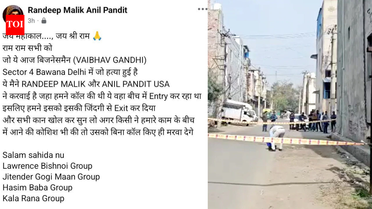 NEW DELHI: In a chilling development that has sent shockwaves through the national capital, the notorious Lawrence Bishnoi gang has claimed responsibility for the daylight murder of a 35-year-old businessman in North Delhi’s Bawana area. The victim, identified as Vaibhav Gandhi, was a plastic granules manufacturer who was intercepted and shot dead on Monday afternoon near his factory in Sector 4 of DSIIDC. The claim surfaced through a social media post authored by an account under the name “Randeep Malik Anil Pandit.” The post, which features a picture of an individual wearing a hoodie, explicitly states that the killing was carried out on behalf of the Lawrence Bishnoi, Jitender Gogi Maan, Hasim Baba, and Kala Rana gangs. Written in a mix of Hindi and English, the message alleges that Gandhi was “interfering” in their operations. “He was entering the middle of our call, so we exited him from his life,” the post read, adding a chilling warning that anyone who attempts to obstruct their “work” will be eliminated without prior notice. The incident occurred around 12:51 pm on Monday when Gandhi was reportedly standing outside his factory holding a laptop bag. According to preliminary police investigations, three bike-borne assailants approached him and attempted to snatch the bag. When Gandhi tried to flee, the gunmen chased him for nearly 50 metres, firing multiple rounds. A bullet hit him in the chin, causing him to collapse on the spot. The attackers then fled with his belongings. Police initially suspected the killing to be a case of robbery gone wrong. However, the emergence of a gang claim has shifted the focus of the investigation towards a deeper conspiracy involving extortion and organised crime. Multiple teams led by DCP (Outer-North) Hareshwar V. Swami have been formed to verify the authenticity of the social media post and trace the digital footprint of the “Randeep Malik” and “Anil Pandit USA” accounts mentioned in the claim. The Delhi Police Special Cell has also been roped in, given the alleged involvement of the Lawrence Bishnoi syndicate, which has been linked to several high-profile assassinations across the country. CCTV footage from the Bawana industrial area is being scanned to identify the shooters and track their escape route.