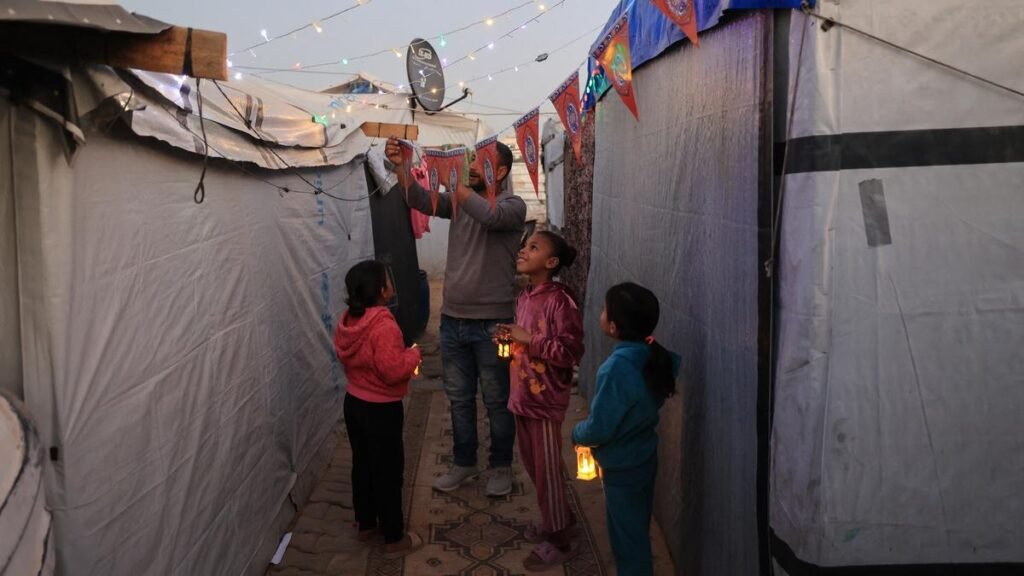 Young displaced Palestinians hold Ramadan lanterns as decorations are set up next to their tents at the Bureij refugee camp in the central Gaza Strip on February 15, 2026.