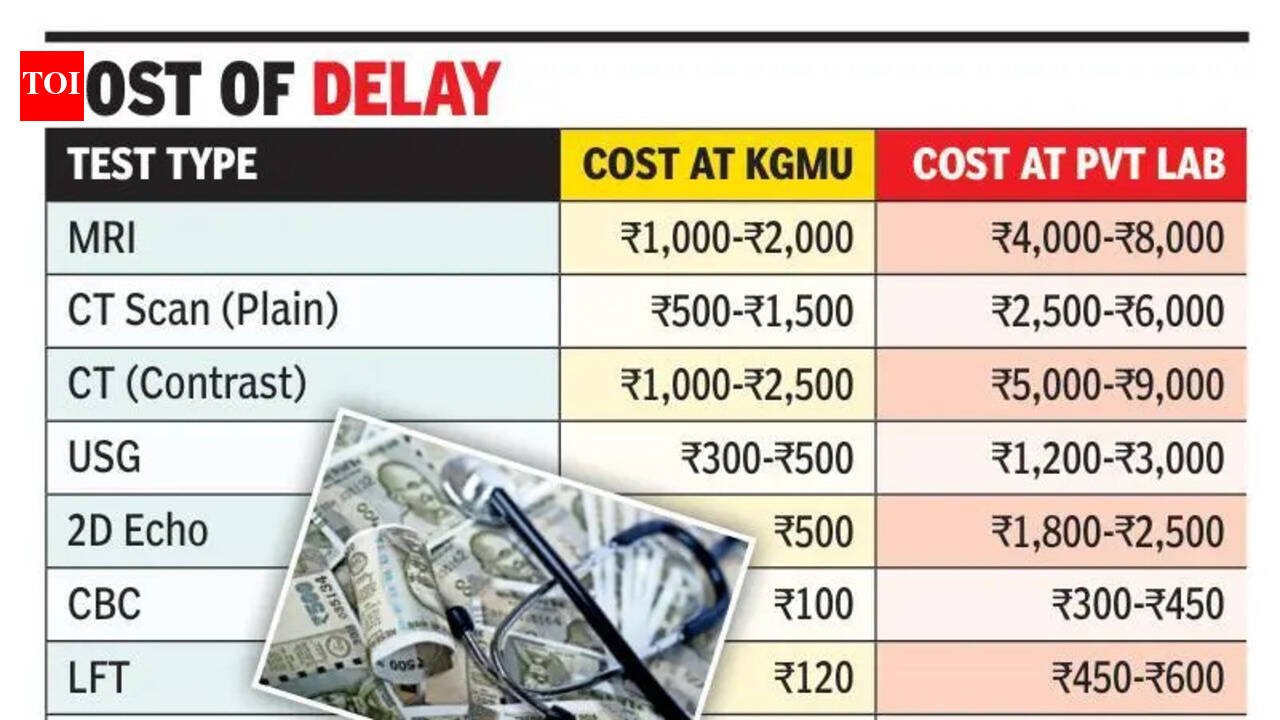 Lucknow: When 36-year-old Versha Singh, who is pregnant, was advised to have an urgent ultrasound at KGMU, her family expected the test to be done quickly. Doctors marked her case as urgent, but she was given Mar 14 as the date. With no other way, the family got the scan done at a private centre to avoid delay, paying 3 times higher than KGMU.Several other patients reported similar experiences, saying waiting periods ranging from 1 week to 2 months forced them to turn to private diagnostic centres and pay several times more. Patients and doctors said these long waiting periods were mainly faced by OPD patients, as admitted and emergency cases were usually prioritised. KGMU receives up to 11,000 OPD patients daily, and submitting blood samples alone can take about 1 hour, with only 3-4 pathology counters handling large volumes. Rakesh Singh, 43, from Chowk locality, was prescribed a USG whole abdomen but was given Feb 21 as the earliest date. Ali Raza, who also requires a USG whole abdomen, received the same date. Both families said they were considering private laboratories to avoid long waits. Raj Kumar, 55, with suspected heart disease, was advised a 2D echo but received a date more than 1 month later. His relatives said the delay pushed them towards private diagnostic centres. Patients said reports often take several days, and many imaging tests are scheduled weeks later because of limited machines and staff. Estimates suggest only about 15 to 20% of prescribed diagnostic tests are completed within the hospital. Diagnostic tests at KGMU remain far cheaper than in private laboratories, but delays are pushing many patients to spend more for faster results. An MRI costing about Rs 1,000 to 2,000 at KGMU may cost Rs 4,000 to 8,000 in private centres while a CT scan priced at Rs 500 to 1,500 can cost Rs 2,500 to 6,000 outside. An ultrasound costing Rs 300 to 500 at KGMU may cost Rs 1,200 to 3,000 privately, and basic blood tests such as CBC, LFT, or platelet count are often 2 to 4 times higher. KGMU officials said steps were taken to reduce waiting times, including extending testing hours, repairing and adding machines, and increasing ultrasound machines for OPD patients from 2 to 6. Spokesperson Prof KK Singh said urgent cases were being prioritised and registration and payment processes were being streamlined. “We are expanding the diagnostic services to reduce waiting time,” he said.